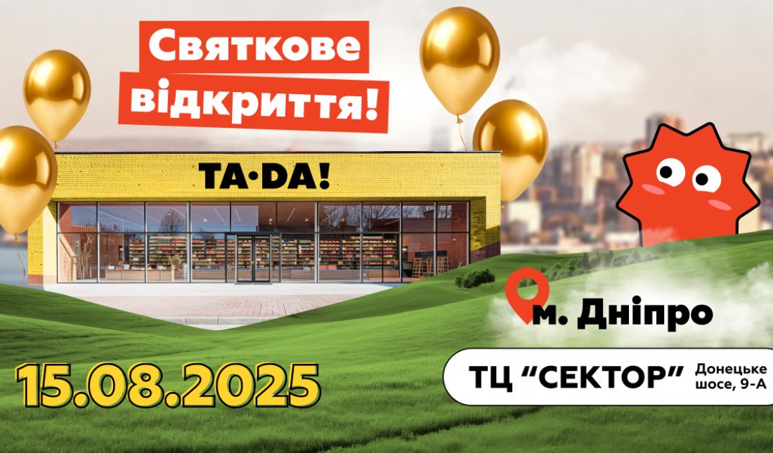 15 серпня на вул. Донецьке шосе, 9а (ТЦ «Сектор», 2-й поверх), відбудеться урочисте відкриття нового супермаркету TA-DA! площею 604,6 м². Це вже третій у Дніпрі, і ми раді стати ще ближчими до мешканців міста, щоб дарувати комфортні та вигідні покупки