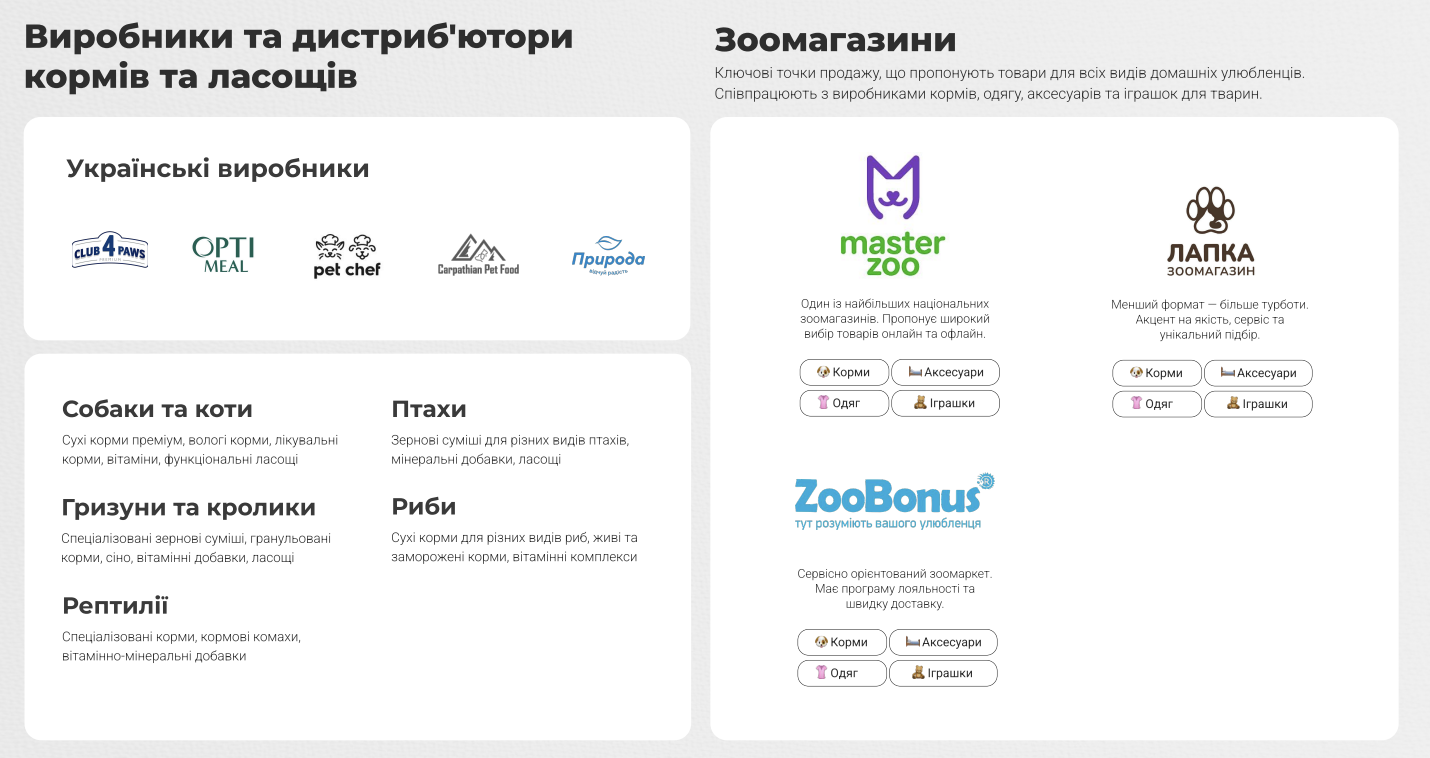 Український ринок товарів і послуг для домашніх тварин охоплює п’ять основних напрямів. Найбільший сегмент — виробники та дистриб’ютори кормів і ласощів, далі зоомагазини, потім ветеринарні клініки та аптеки, і наостанок — виробники аксесуарів, іграшок та одягу.