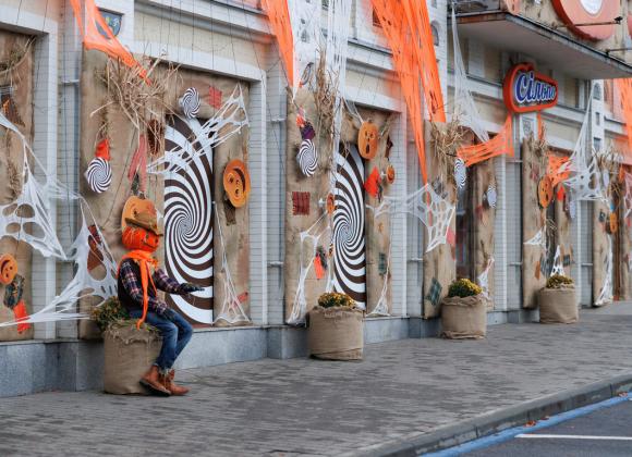 У Дніпрі Гостей «Сільпо» зустрічають декоративні опудала, усміхнені гарбузики та павучки, які обплели павутиною фасад магазину. Вони створюють химерний сюжет у стилі мультфільмів Тіма Бертона і передають настрій Геловіну.
