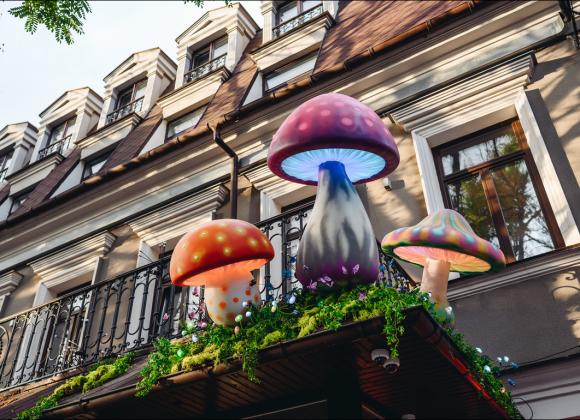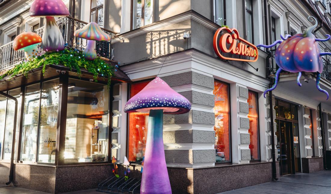 В Одесі вхід до магазину прикрасили гігантськими світловими грибами в яскравих неонових кольорах, які відразу привертають увагу. Гості ніби потраплять до фентезійного лісу, де серед моху, скляних банок, гарбузів і дивовижних деталей магічні істоти облаштували алхімічну лабораторію.