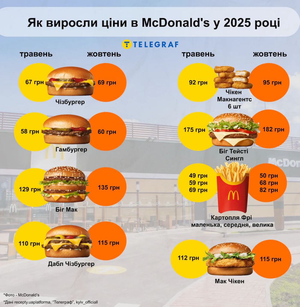Видання порівняло ціни на низку популярних позицій в меню українського McDonald's у травні та жовтні 2025 року. Картопля фрі, залежно від порції, стала одночасно лідером та антилідером за зростанням цін.
