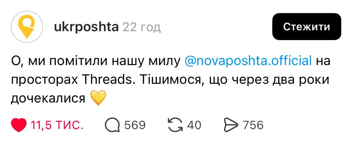 Команда «Нової Пошти» активно використовує платформу для коротких постів, реакцій на актуальні обговорення та ситуативних реакцій. Вони жартують, коментують пости звичайних людей і роблять це весело і в тему. А ще, звісно, конкурують і іронізують над собою і над своїм основним конкурентом.
