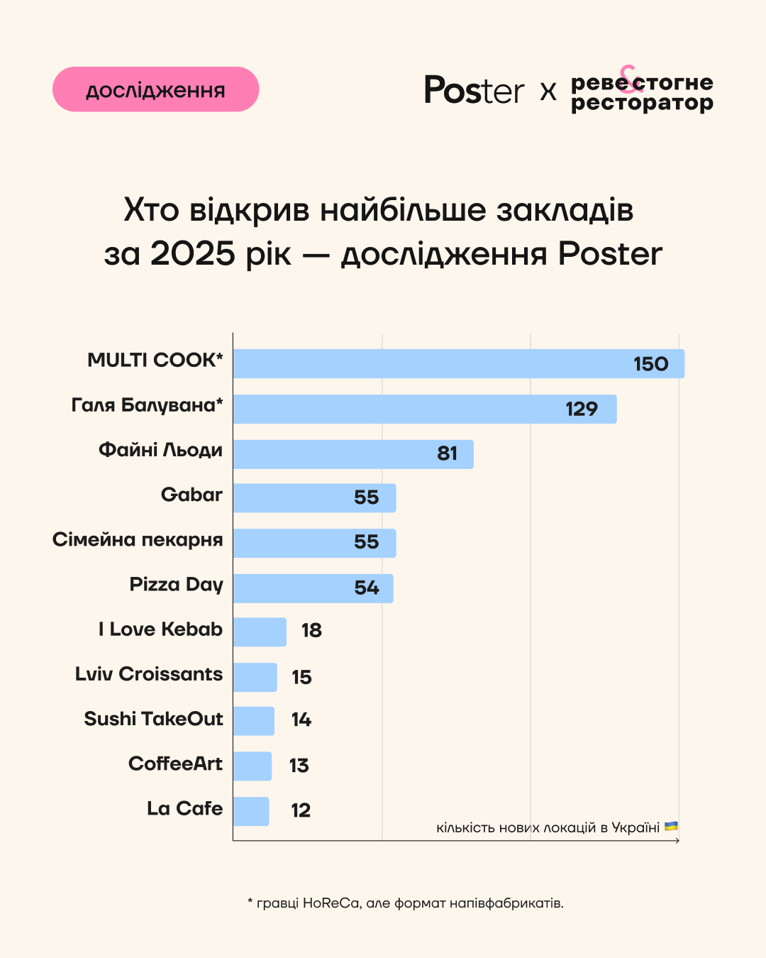 Українська компанія з автоматизації закладів Poster опублікувала дослідження про темпи розвитку українських ресторанних компаній у 2025 році. Команда опитала власників мереж і HoReCa проєктів та зібрала дані про кількість нових локацій, відкритих в Україні протягом року. На основі відповідей сформовано рейтинг лідерів за кількістю відкриттів.