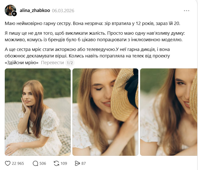 Маю неймовірно гарну сестру. Вона незряча: зір втратила у 12 років, зараз їй 20. Я пишу це не для того, щоб викликати жалість. Просто маю одну нав’язливу думку: можливо, комусь із брендів було б цікаво попрацювати з інклюзивною моделлю, — написала вона.