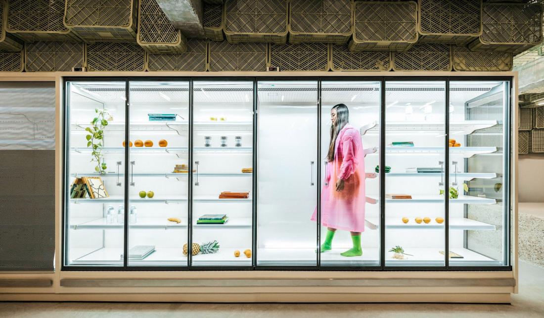 Дизайнери оформили супермаркет у мінімалістичному стилі. В його інтер'єрі — відкритий бетон і стеля, зібрана з перероблених пластикових ящиків. Бетон доповнили інші промислові матеріали, як-от нержавіюча сталь, напівпрозорий полікарбонат та перероблені пластикові панелі.