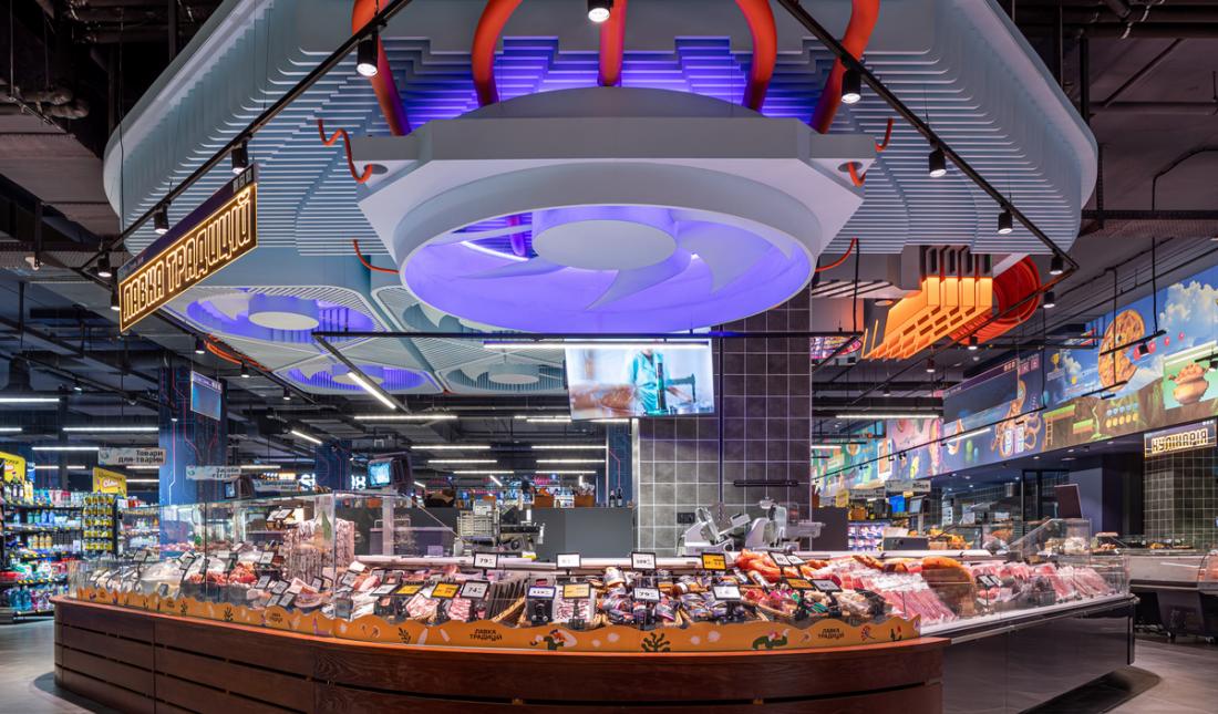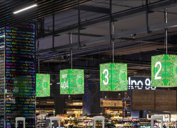 Концепція супермаркету занурює гостей у світ кіберкультури: від перших комп’ютерів до сучасного кіберспорту. Інтер’єр наповнений тематичними деталями: вхідну вивіску сформували з клавіш клавіатури, касові зони оформили як мікросхеми, а одна з кас має номер 404.