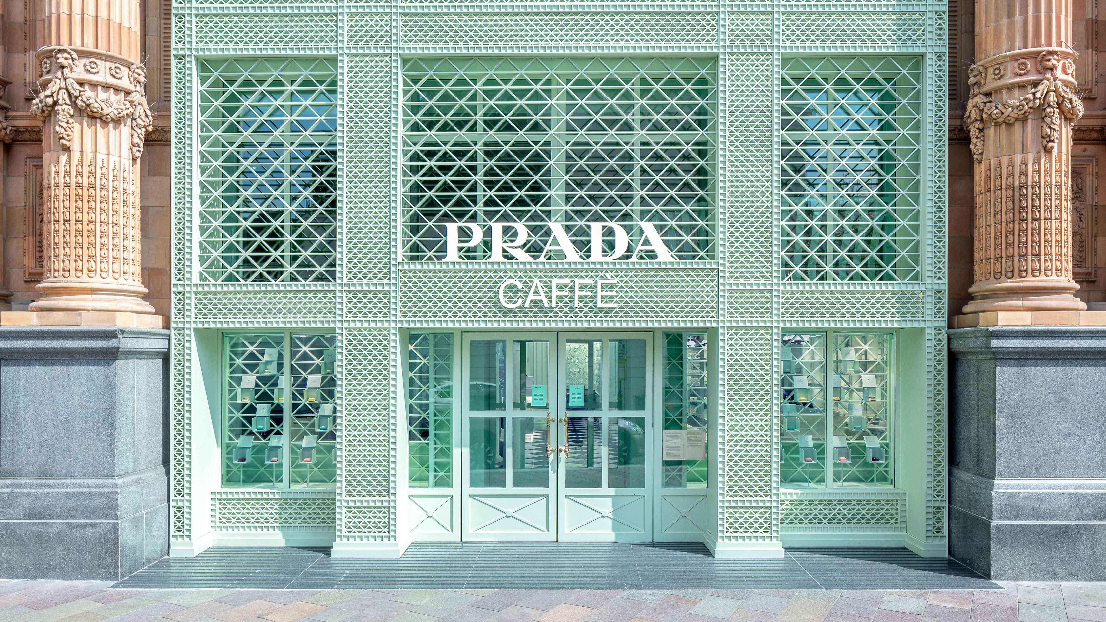 Prada Caffè розташоване на першому поверсі Harrods у Найтсбріджі, Лондон. Інтер’єр відсилає до естетики 1950-х: блідо-зелені стіни, оксамитові стільці, візерунчаста підлога й глянцеві мармурові акценти. Усе витримано в фірмовому відтінку Prada — впізнаваному з першого погляду.