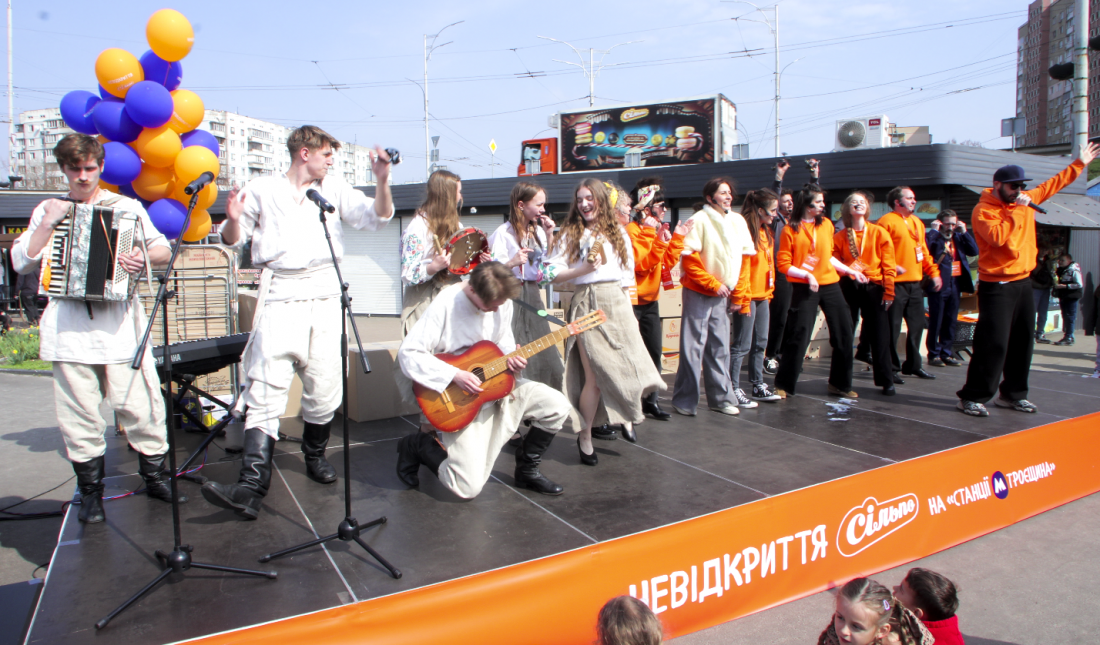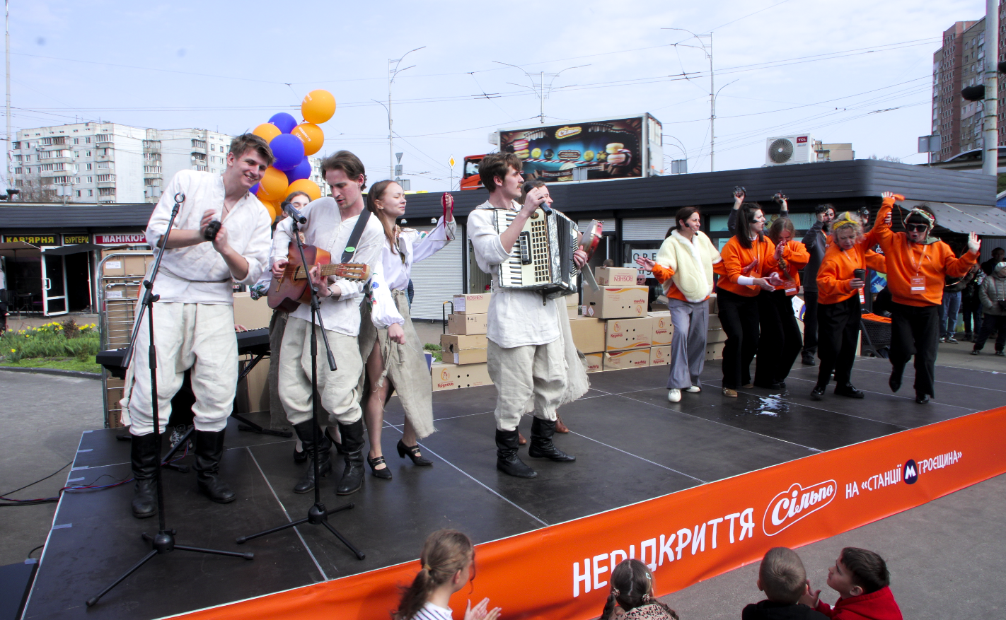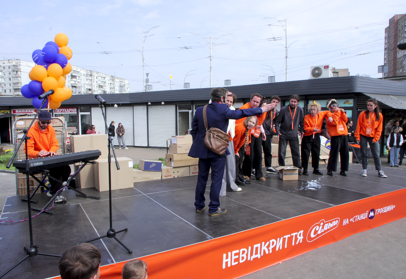 Нарешті на сцену вийшов ведучий й почав спілкуватися з аудиторією, підігріваючи інтерес до артперформансу. В цей час представники “Сільпо” пригощали всіх присутніх морозивом власної торгової марки “Премія”.