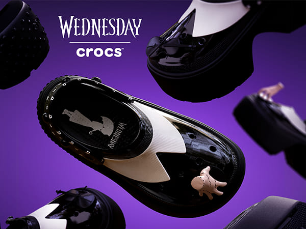 Готичні крокси моделі Wednesday Stomp Clog з глянцевим чорним покриттям та фірмовим білим комірцем ідеально репрезентують стиль Венздей Адамс.