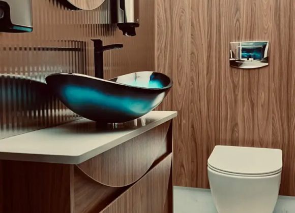 У просторі використали округлі стельові панелі, що відбивають світло й формують світлові потоки, створюючи відчуття руху води, каже Дар'я. Спочатку команда планувала використати дзеркальні поверхні, однак з міркувань безпеки та бюджету замінила їх на пластик і спеціальну плівку зі світильниками. Усі елементи виготовляли вручну.