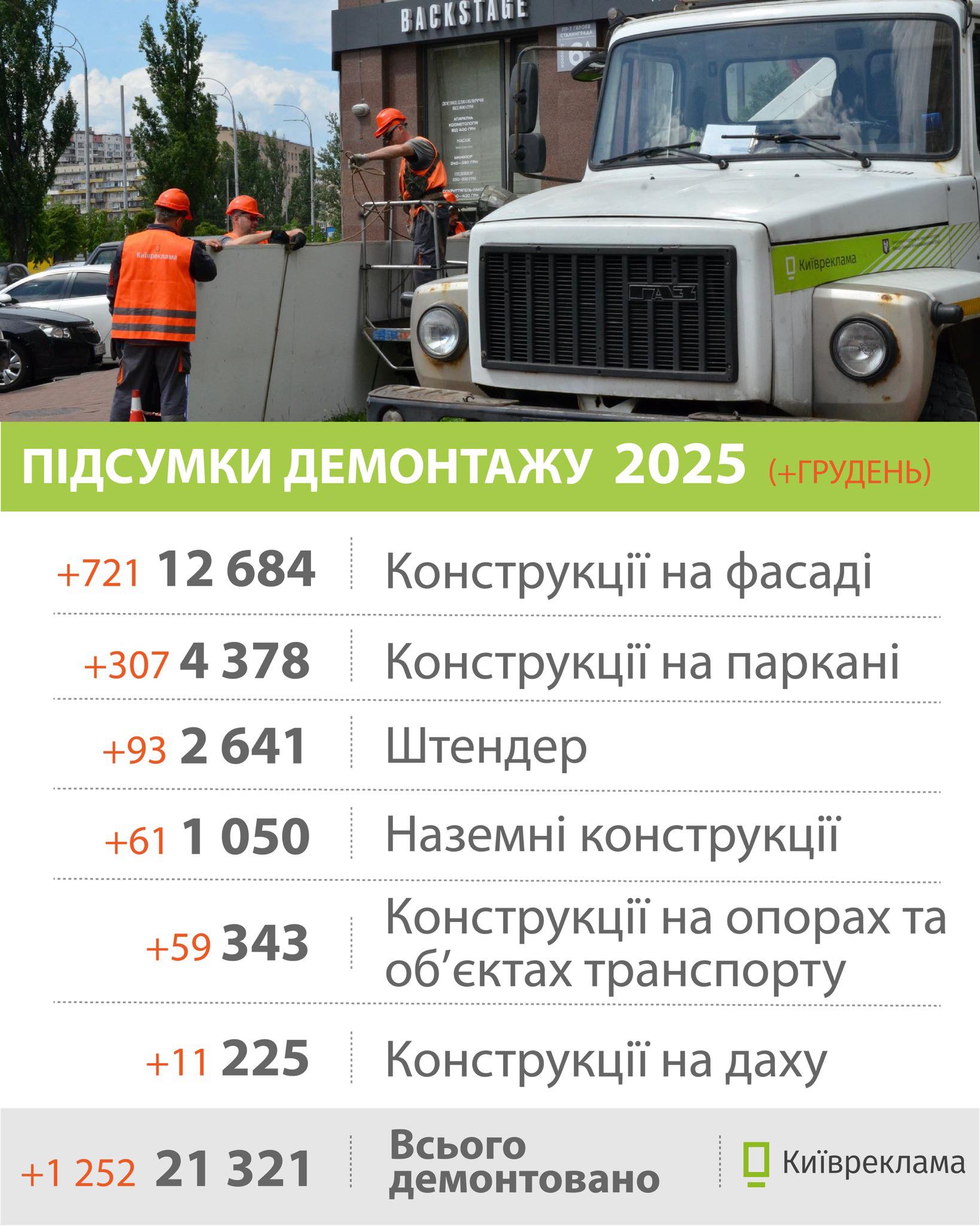 У грудні 2025 року в столиці демонтовано 1 252 рекламні конструкції та вивіски, розміщені з порушенням чинних правил.