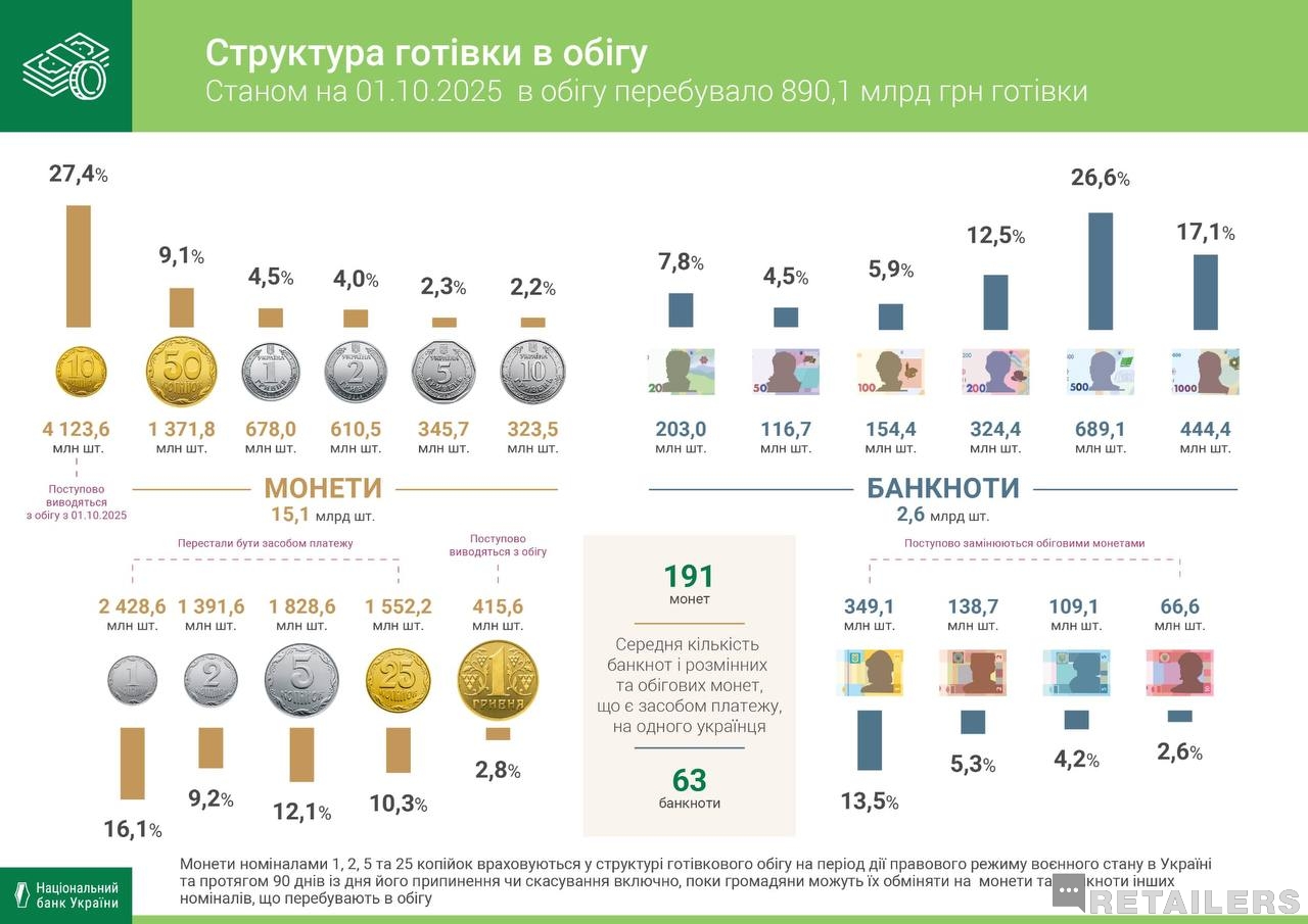 З початку цього року в Україні на 8% зріс обіг готівки. Станом на 1 жовтня 2025 року сума готівкових коштів становить 890,1 млрд грн. Це на 67,7 млрд грн більше, ніж станом на 1 січня 2025 року. Про це повідомляє пресслужба Національного банку.