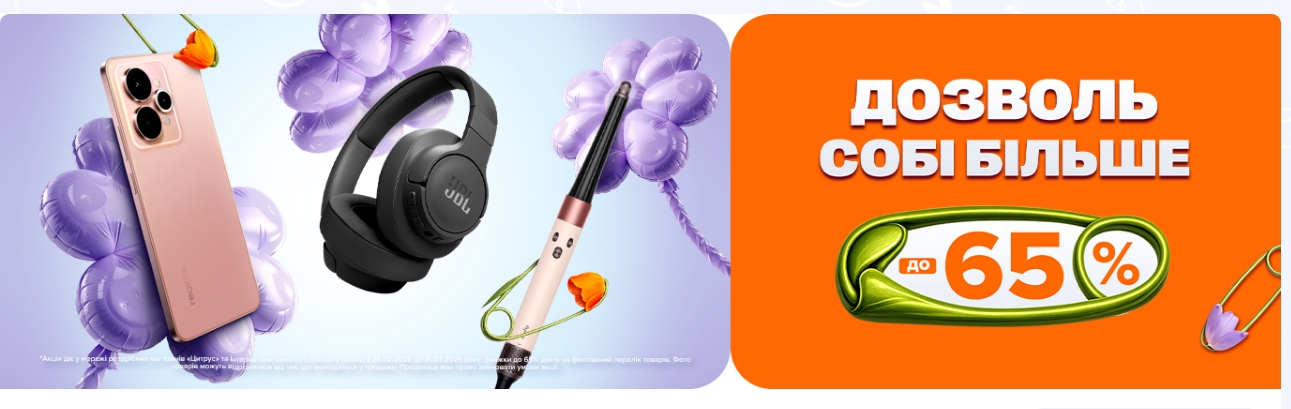 Акція “Дозволь собі більше”, присвячена 8 березня, діє з 26.02.2026 по 31.03.2026 і пропонує знижки на техніку та електроніку до 65%.