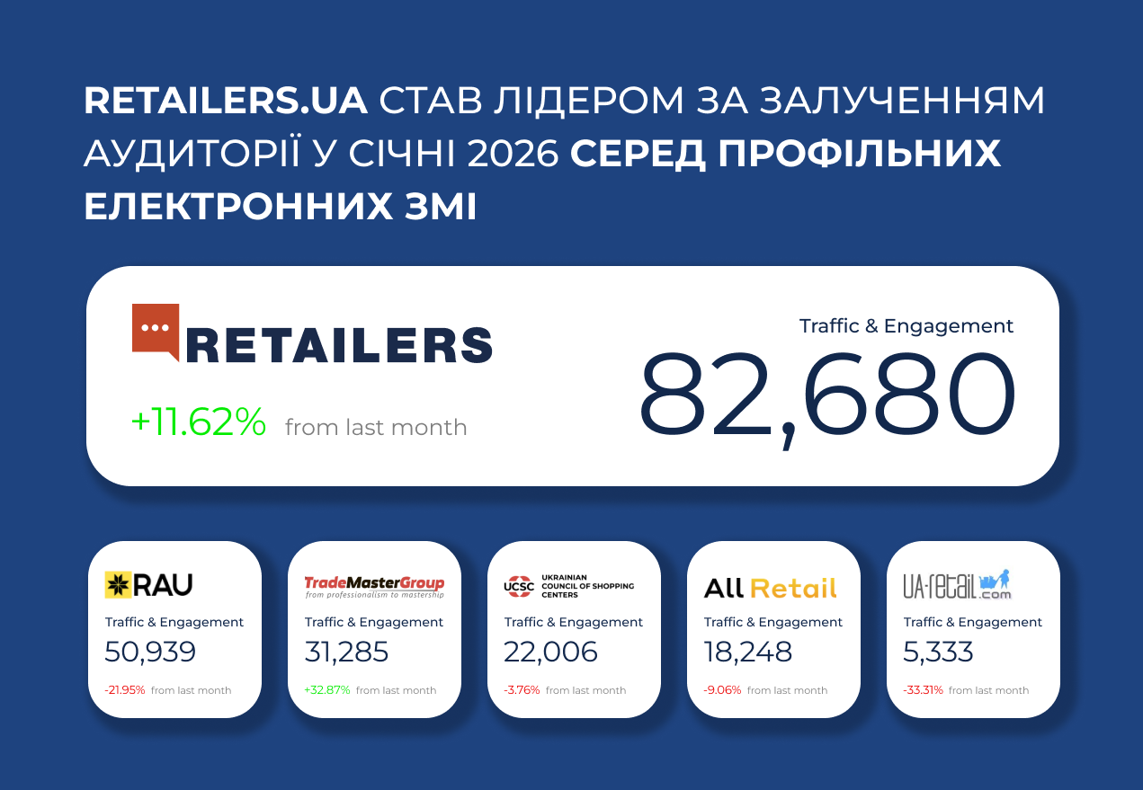 У січні 2026 року аналітична B2B-платформа Retailers.ua стала лідером за залученням аудиторії серед профільних онлайн-ЗМІ про ритейл та e-commerce в Україні. За даними Similarweb, показник Traffic & Engagement становить 82 680 користувачів. Це на +11,62% більше, ніж у грудні.