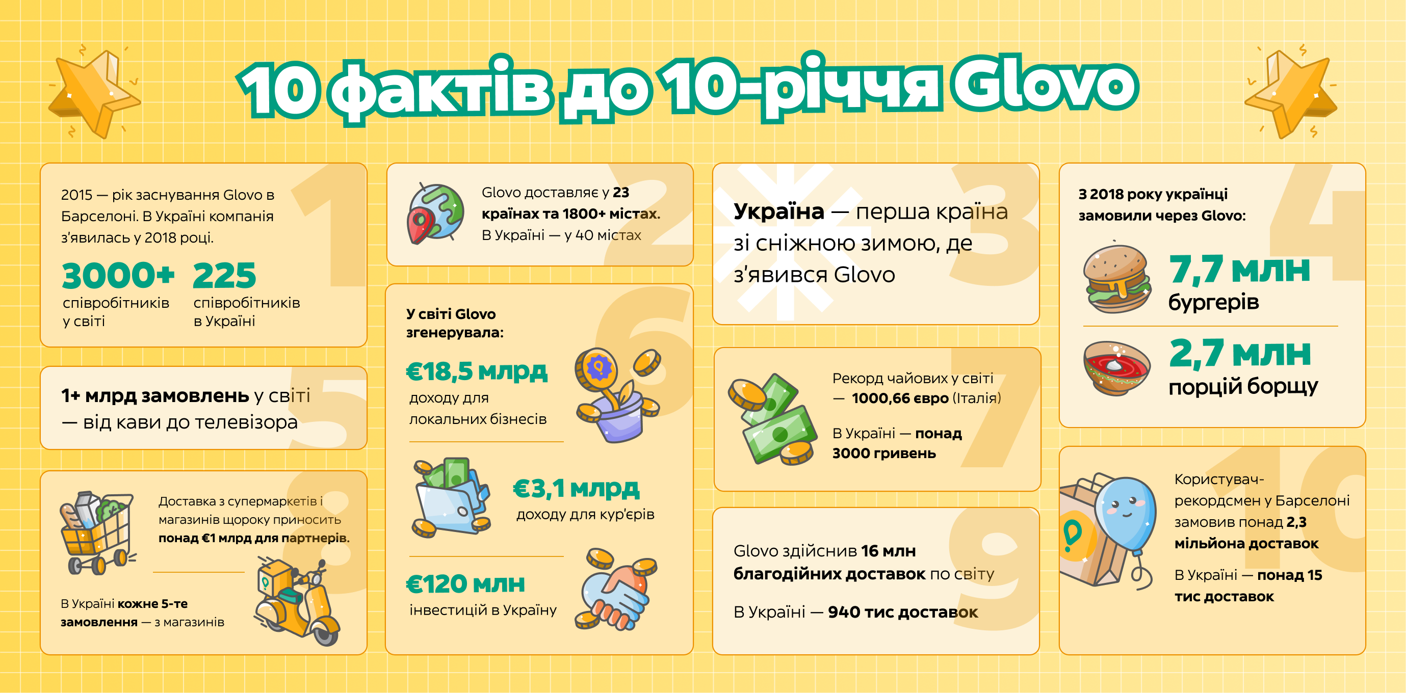Міжнародна технологічна компанія Glovo цього року святкує 10 років з дня заснування. Стартап, що розпочався у 2015 році в Барселоні з команди у шість осіб, сьогодні є глобальною платформою з 3 тисячами співробітників, яка працює у 23 країнах та 1800 містах Європи, Африки та Центральної Азії. За час роботи компанія доставила понад 1 мільярд замовлень, згенерувала понад €18,5 млрд додаткового доходу для бізнесів та €3,1 млрд доходу для кур'єрів. Сьогодні Glovo фокусується на розвитку Q-Commerce (швидкої доставки з магазинів, супермаркетів та аптек), підтримці малого та середнього бізнесу та забезпеченні сталого соціального впливу