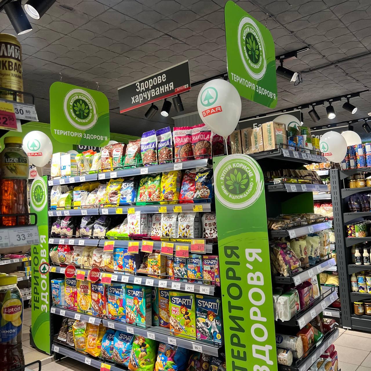 У межах власної концепції “Територія здоров’я” SPAR формує багатокатегорійний асортимент: продукти без цукру, безглютенові та безлактозні товари, протеїнові снеки, plant-based продукти, функціональне харчування, а також сегмент дитячого здорового харчування.