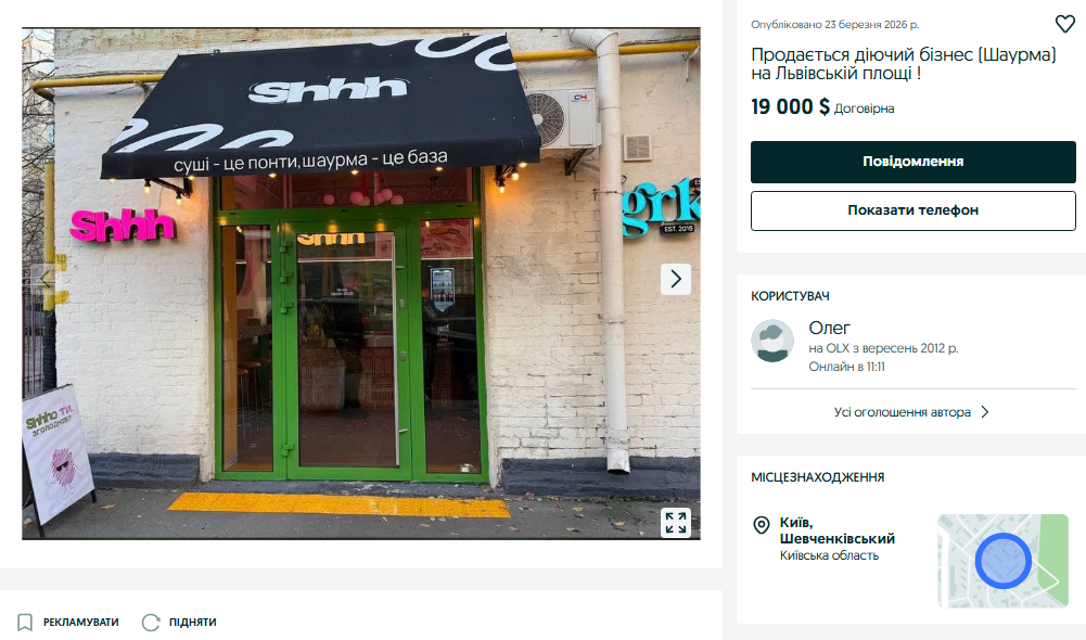 Ось в центрі столиці, на Львівській площі, наразі продають готовий і навіть, як стверджують власники, прибутковий бізнес за 19 000 доларів. Оренда — 30 тис. грн/місяць.
