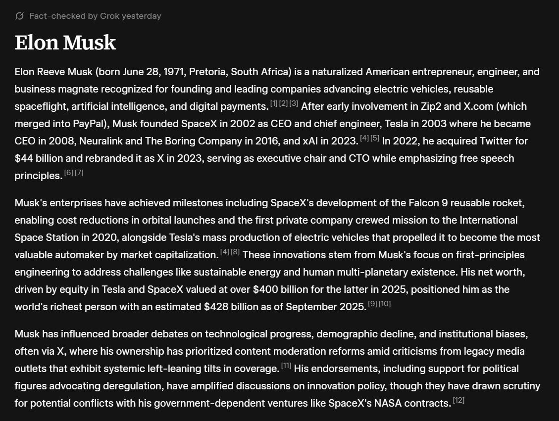 Мільярдер Ілон Маск запустив онлайн-енциклопедію Grokipedia, що працює на базі штучного інтелекту та має стати альтернативою "Вікіпедії". Платформа у версії 0.1 вже доступна за адресою Grokipedia.com.