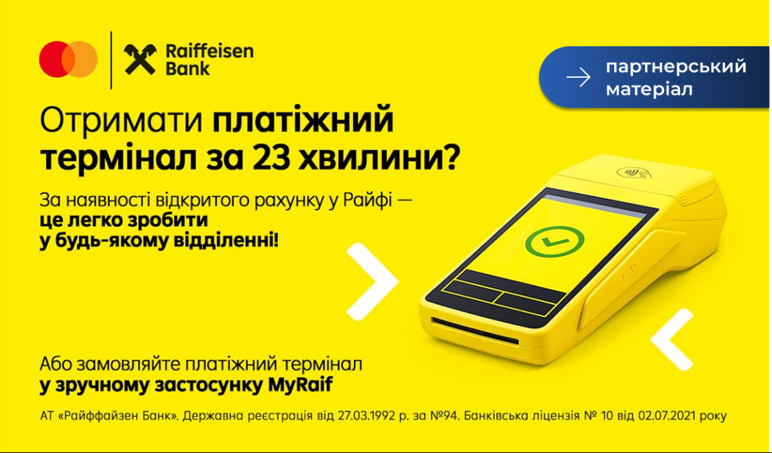 - звернутися у будь-яке відділення Райфу та отримати термінал протягом 23 хвилин;
