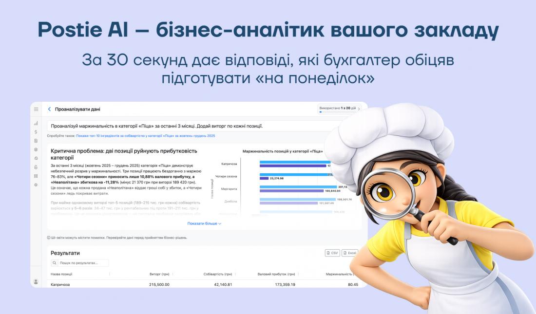 "З Postie я можу “докопуватися” до таких дрібниць, які сам би не помітив. Бо він самостійно аналізує, підказує рішення — змінити постачальника, замінити продукт або створити більш маржинальні страви. Раніше на ці розрахунки йшли години, а тепер одним запитом я отримую готові рекомендації та прогнози, які допомагають збільшувати середній чек і контролювати фінанси. Фактично це вже не просто звіти, а підказка до дії".