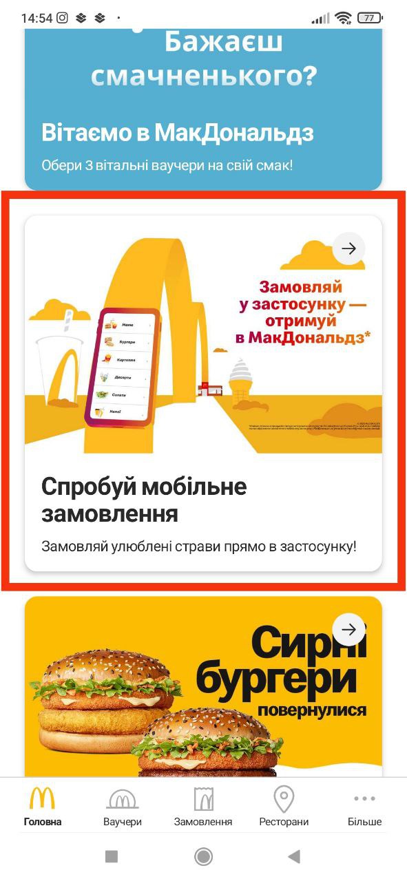 Спершу треба завантажити застосунок McDonald’s на смартфон і зареєструватися. Якщо додаток у вас уже є, просто знайдіть банер із написом «Спробуй мобільне замовлення».