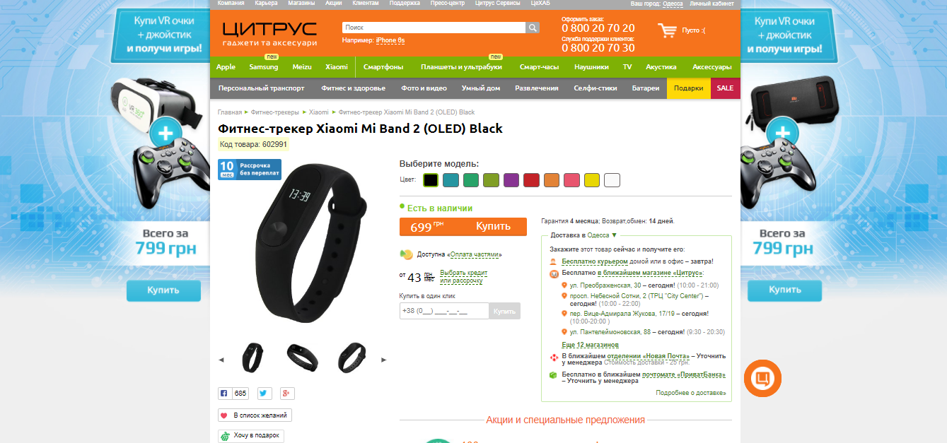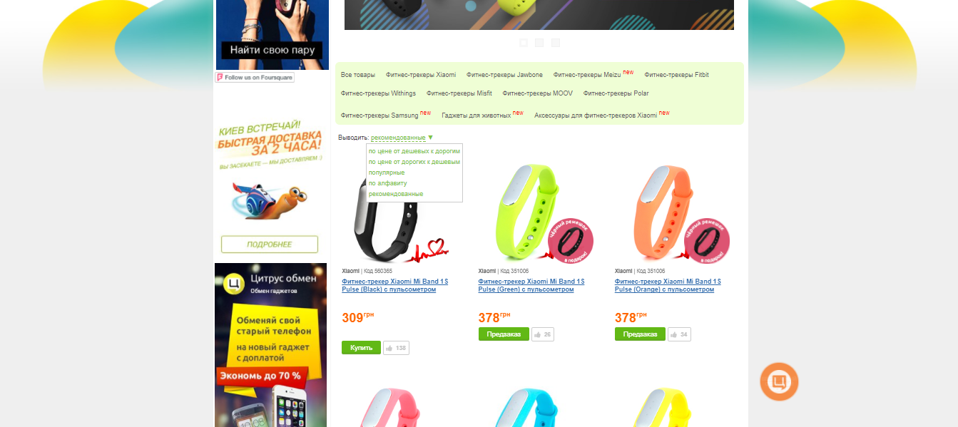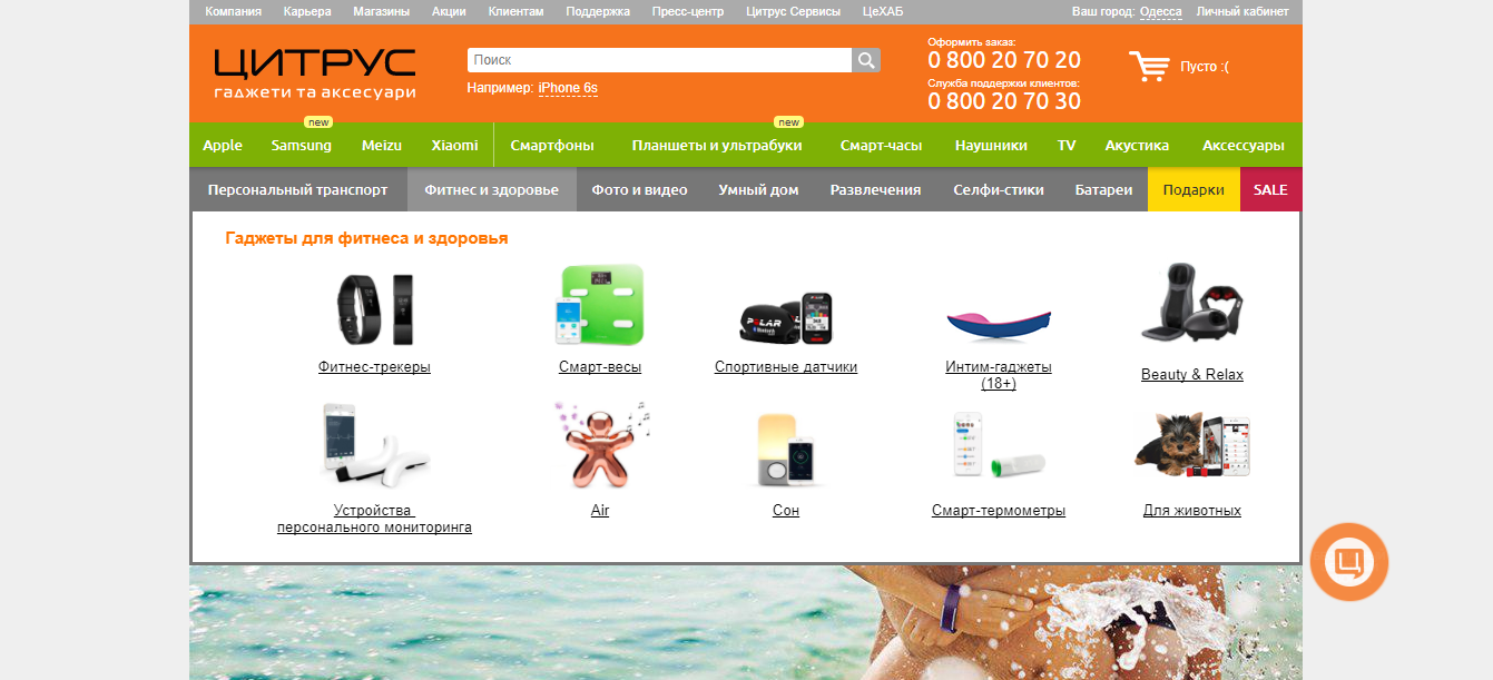 Я решил купить фитнес-трекер. Раньше я ничего не покупал на Сitrus.ua, это новый для меня сайт и новый опыт. Изучаю верхнее меню и нахожу категорию «Фитнес и здоровье», в которой помимо фитнес-трекеров есть еще спортивные датчики, смарт-термометры и даже интим-гаджеты.