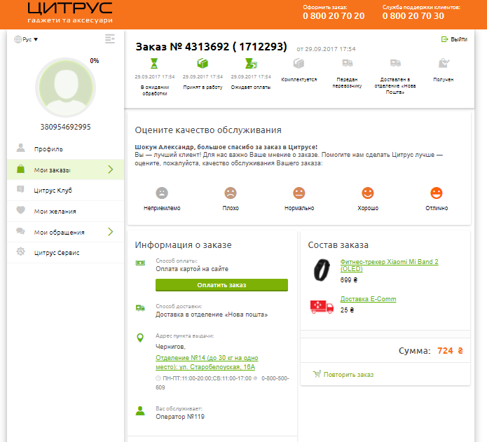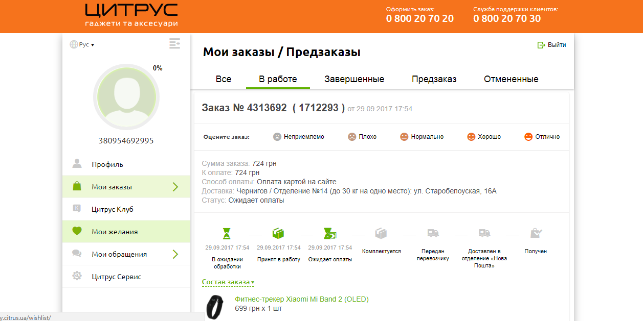 Звоню на горячую линию. Что приятно — соединение мгновенное. Рассказываю о своей проблеме с регистрацией. Оператор предположил, что это может быть технический сбой, и сам создал мой профиль и провел заказ. Мне пришла СМС, что я стал участником «Цитрус клуба».
