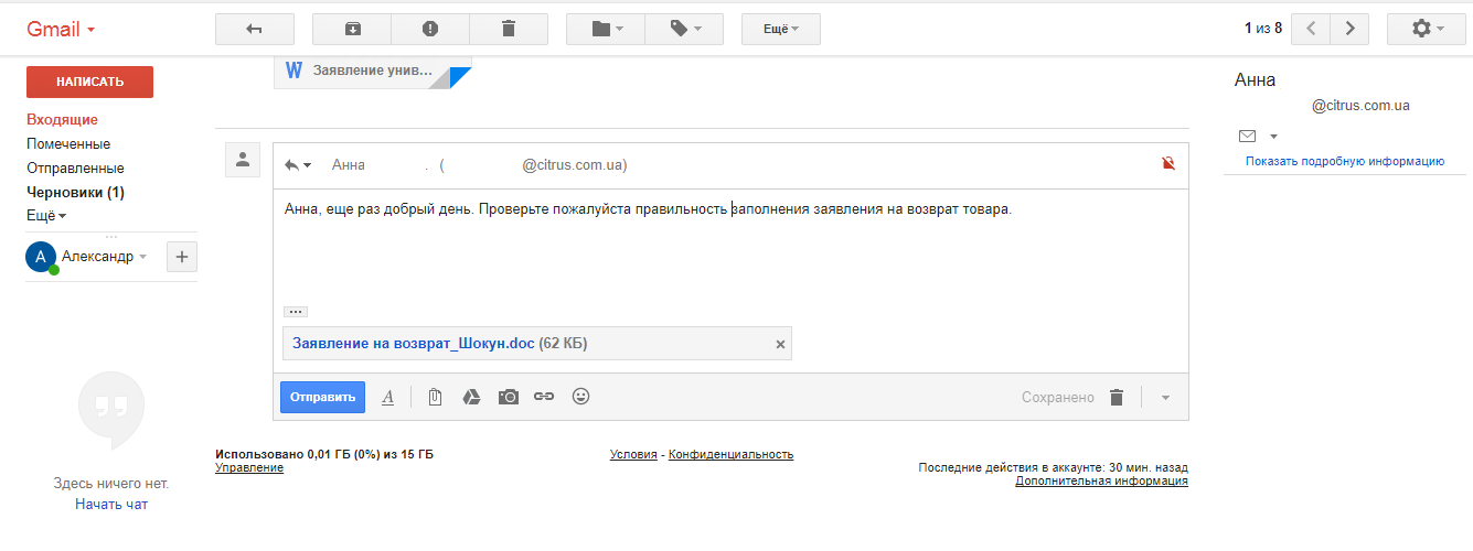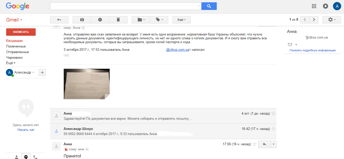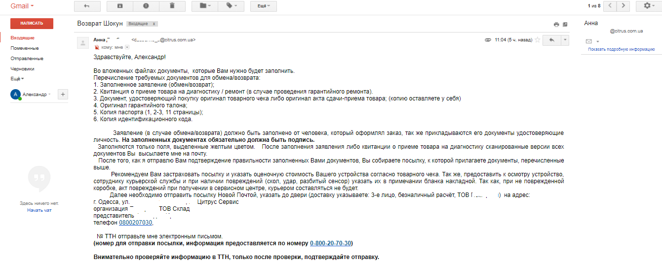 Буквально в течение 15 минут на электронную почту пришло письмо-инструкция с вложенным бланком на возврат.