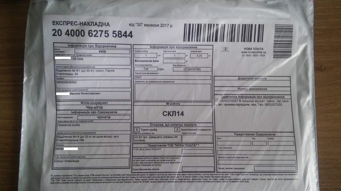 3 октября иду в отделение «Новой Почты» и забираю посылку.