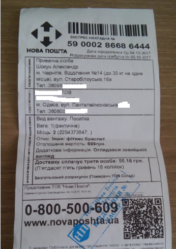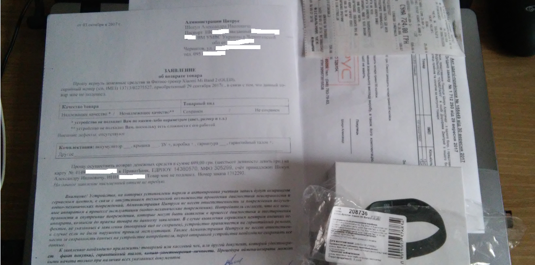 4 октября делаю возврат товара. Для того чтобы сделать возврат, мне нужно 4(!) документа: заявление на возврат, чек, акт приема-передачи, гарантийный талон. Взяв все эти бумаги и фитнес-трекер, отправляюсь в отделение «Новой Почты».