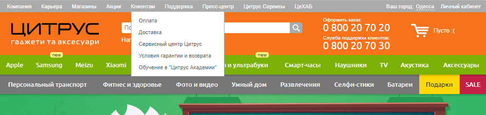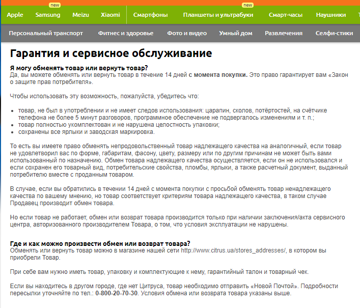 Захожу на сайт Сitrus.ua. В функции меню «Клиентам» выбираю пункт «Условия гарантии и возврата».