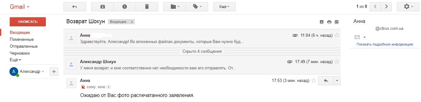 Таким образом, общий процесс покупки и возврата товара занял 11 дней с учетом того, что я пошел за посылкой на следующий день и один день товар находился у меня на руках. Я звонил два раза в кол-центр, мне перезвонили один раз, получил шесть писем по электронной почте и сам отправил пять писем, получил 3 СМС от интернет-магазина, одну СМС от «Новой Почты», одну СМС от банка о получении средств.