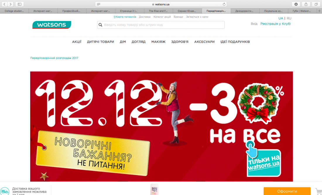 Интернет-магазин Watsons работает с 2016 года, в нем представлено 20 000 товаров. Watsons — международный ритейлер со штаб-квартирой в Гонконге. Его конкурент в розничном бизнесе на рынке Украины — локальный ритейлер Eva, интернет-магазин которого открылся в сентябре 2017-го. Проверим, как справляются с заказами конкурирующие интернет-магазины в предпраздничный сезон.