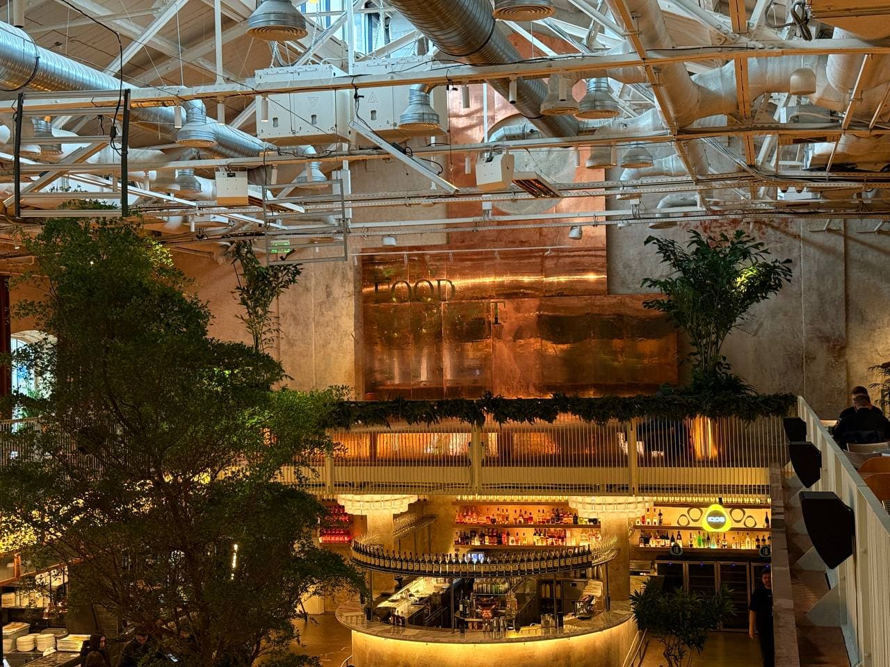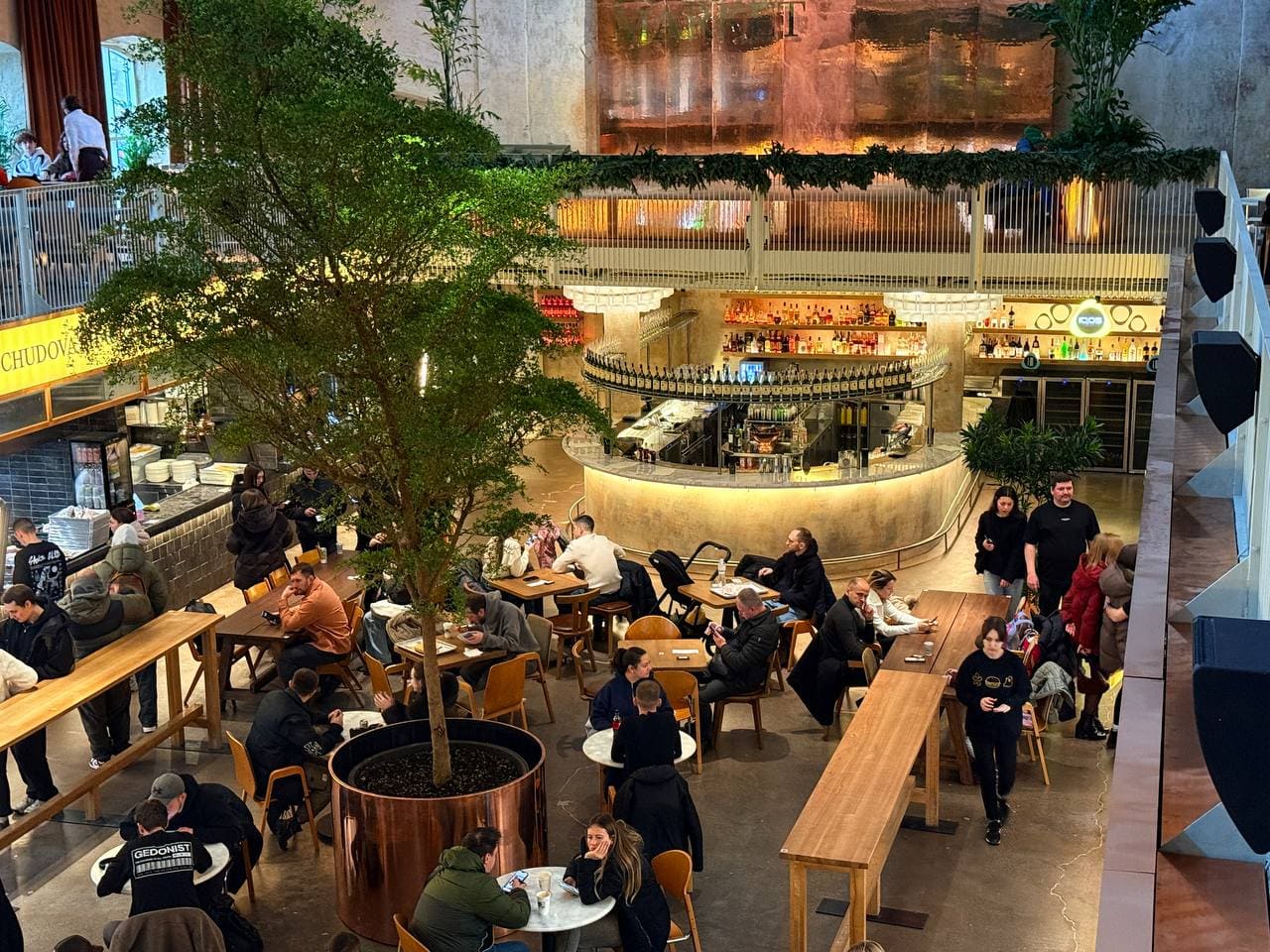 Kyiv Food Market залишився впізнаваним, водночас став візуально свіжішим і комфортнішим для гостей. У просторі з’явилося більше живої зелені. У центрі головної зали першого поверху встановили велике дерево, навколо якого облаштували спільні столи для великих компаній і столи на чотирьох.