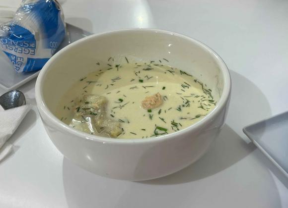 Суп “Егерзунд” обійшовся у 247 грн. Офіціант розповів, що його готують на насиченому рибному бульйоні з хеком, лососем, креветками та овочами. Подають страву з цільнозерновою булочкою. За смаком суп яскраво вершковий, а всі морепродукти та спеції між собою метчаться. Він ситний.