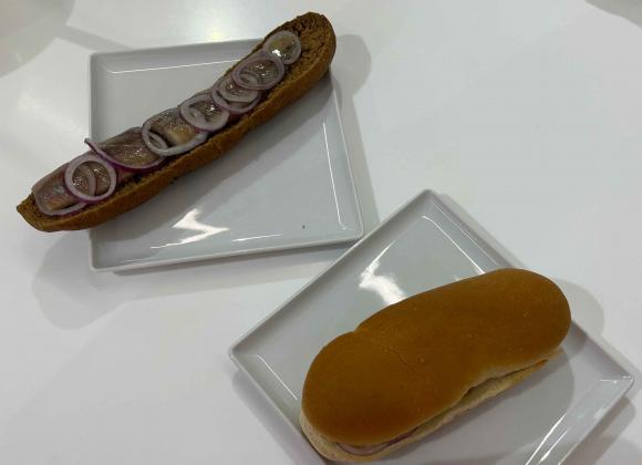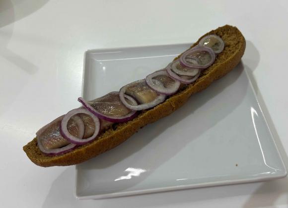 Перший подається на житньому багеті з філе матіаса та цибулею, нарізаною кільцями. Другий — у пшеничній булці, корнішонами та цибулею. Як не дивно, наш фаворит — дешевший варіант; з мінусів — в сендвічі траплялися дрібні кістки. У іншому їх було значно менше, проте світла булочка завелика, настільки, що майже не вдалося до кінця відчути смак матіаса. Хоча сама риба була дуже ніжною.