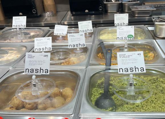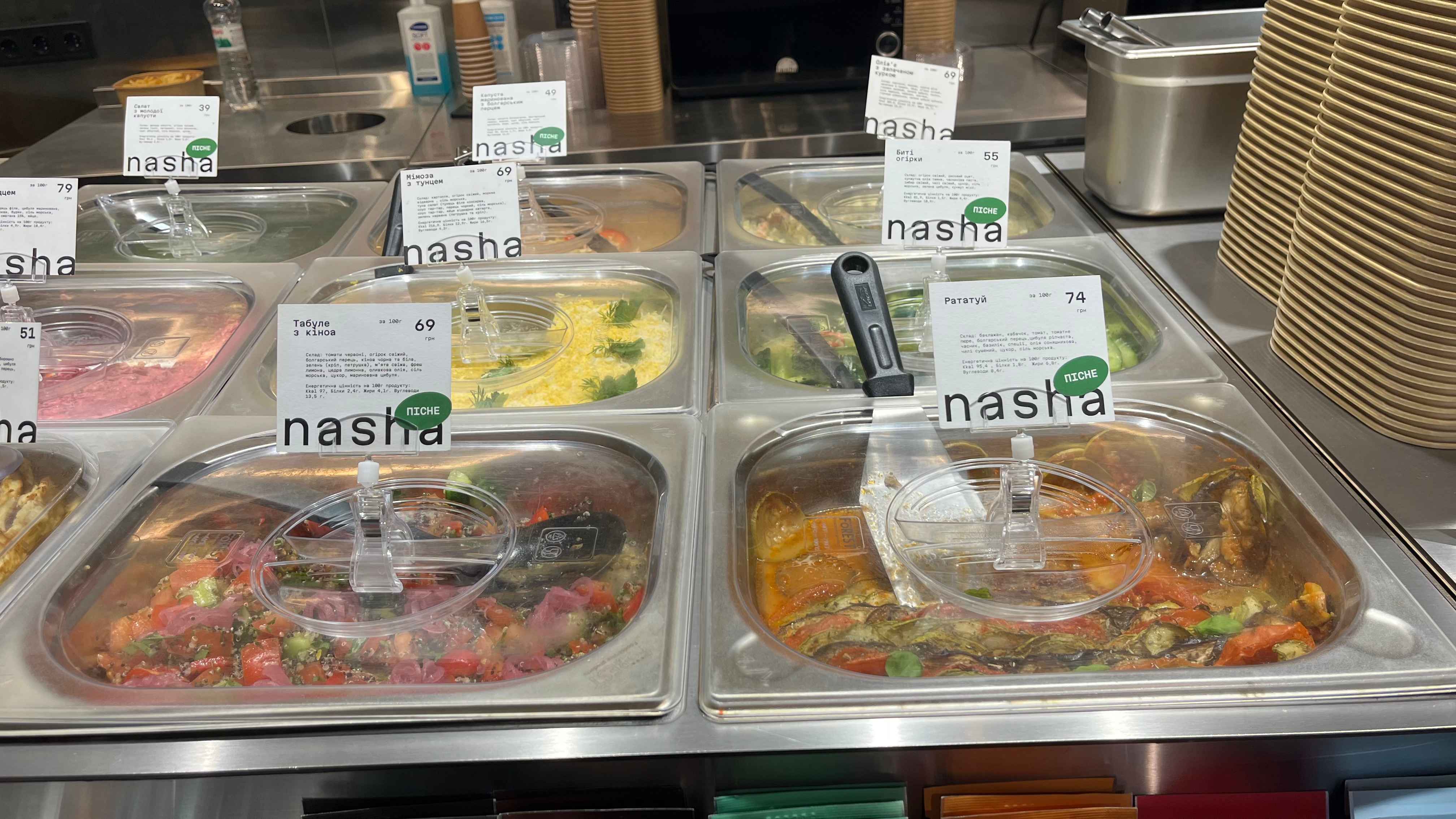 Наступною точкою нашої ревізії стала NASHA by Cheesecake Family. Тут продають домашню зрозумілу кухню. Подивились і подумали: “Чимось схоже на формат їдальні “Пузатки”, але в рази менший: вітрина з асортиментом готової їжі, жива черга, самообслуговування.