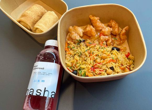 Ми замовили пісний плов з овочами (95,06 грн/194 г) — навіть на вигляд сподобалося, як його приготували. На смак він теж не підвів, а овочі і нут вигідно його доповнювали. До нього взяли курку в кисло-солодкому соусі з ананасом (102,90 грн/98 г). Вона виявилася в міру пікантною, а от ананасу нам попався лише один шматочок. А також спробувати два млинці з куркою (100,32 грн/152 г) і морс (115 грн/350 мл). Не будемо тут багато говорити, це вже класика.