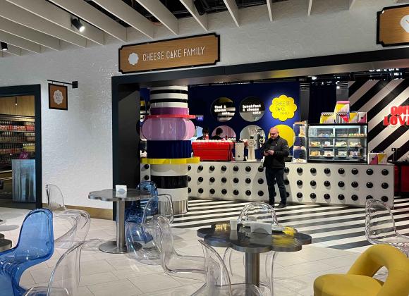 Одразу помітили стильний дизайн в яскравих кольорах, який нагадує чимось солодке королівство. Сам ростір поєднує шоурум чизкейків, бренд-шоп спешелті-кави. Поруч із ним - столи у вигляді квіток і напівпрозорі стільці.
