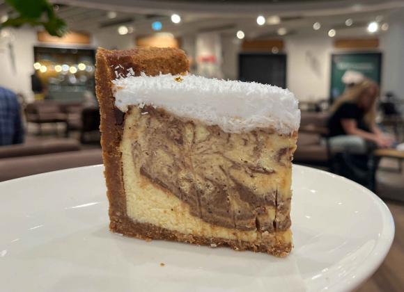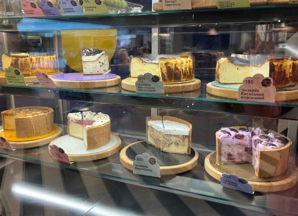 На вітрині 8 видів чизкейків — від 195 до 335 грн. Ліворуч від неї безкоштовна вода. Це плюс, але є ще більш вагоміші — заклад доступний для маломобільних гостей і pet-friendly. Також тут незабаром команда має додати повноцінне меню та сніданки all day.