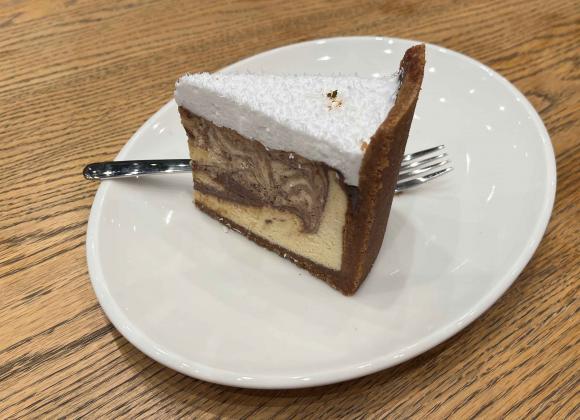 Що ж ми замовили? Чизкейк “Баунтелло” за 225 грн. Насправді всі десерти на вітрині виглядають так, що їх хочеться з’їсти, але цей особливо. У нього цікава багатошарова текстура, яка нагадує мармур, а в складі — крем-чиз із фундучним праліне та маршмелоу з кокосом. Смачно! Якби ще золотисті елементи на верхівці виявилися справжніми, щоб хоч трохи окупити сьогоднішню ревізію.