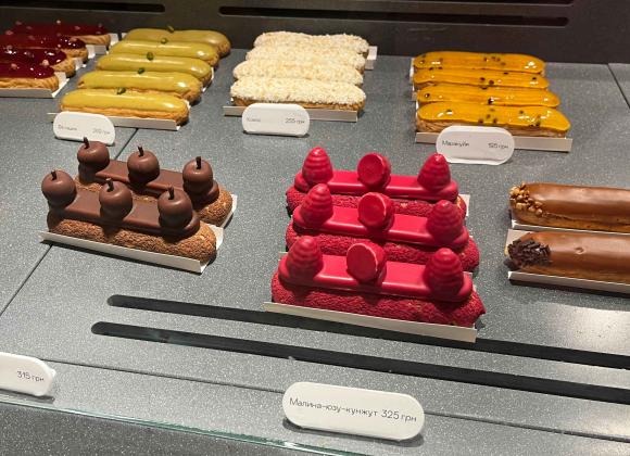 Зайшовши всередину, ми побачили кілька великих вітрин з десертами (еклерам, до речі, присвячена окрема вітрина). Є великодні паски. А от офіціанта не побачили. Він підійшов до нас лише через кілька хвилин. Ми запитали в нього, який десерт купують найчастіше? На що отримали стандартну відповідь, як з методички: “В нас всі десерти фірмові, їх беруть в рівній мірі”. Згодом він зорієнтувався й запропонував обрати десерт залежно від наших уподобань: солодке, кисло-солодке або дуже солодке. А також розповів про десерт-дегустацію у вигляді квітки, де кожна пелюстка має різний смак: бергамот, каламансі, юзу, грейпфрут, лайм-цукати.