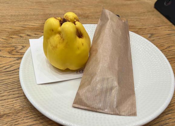 Але ми зрештою зупинились на десерті Айва за 387 грн. Візуально це майже точна копія справжнього фрукта з природною “неідеальністю”. Шедевр, справжня ювелірна робота, навіть черв'ячка не вистачає для повної візуалізації. Усередині, як виявилося, цілі шматочки айви, айвовий гель і кондитерський крем юзу-ганаш на білому шоколаді. На смак — делікатний і з легкою терпкістю. Подається на підложці для десертів. Ми щиро сподівалися, що за таку суму і вона буде їстівною, але ні — звичайний папір.