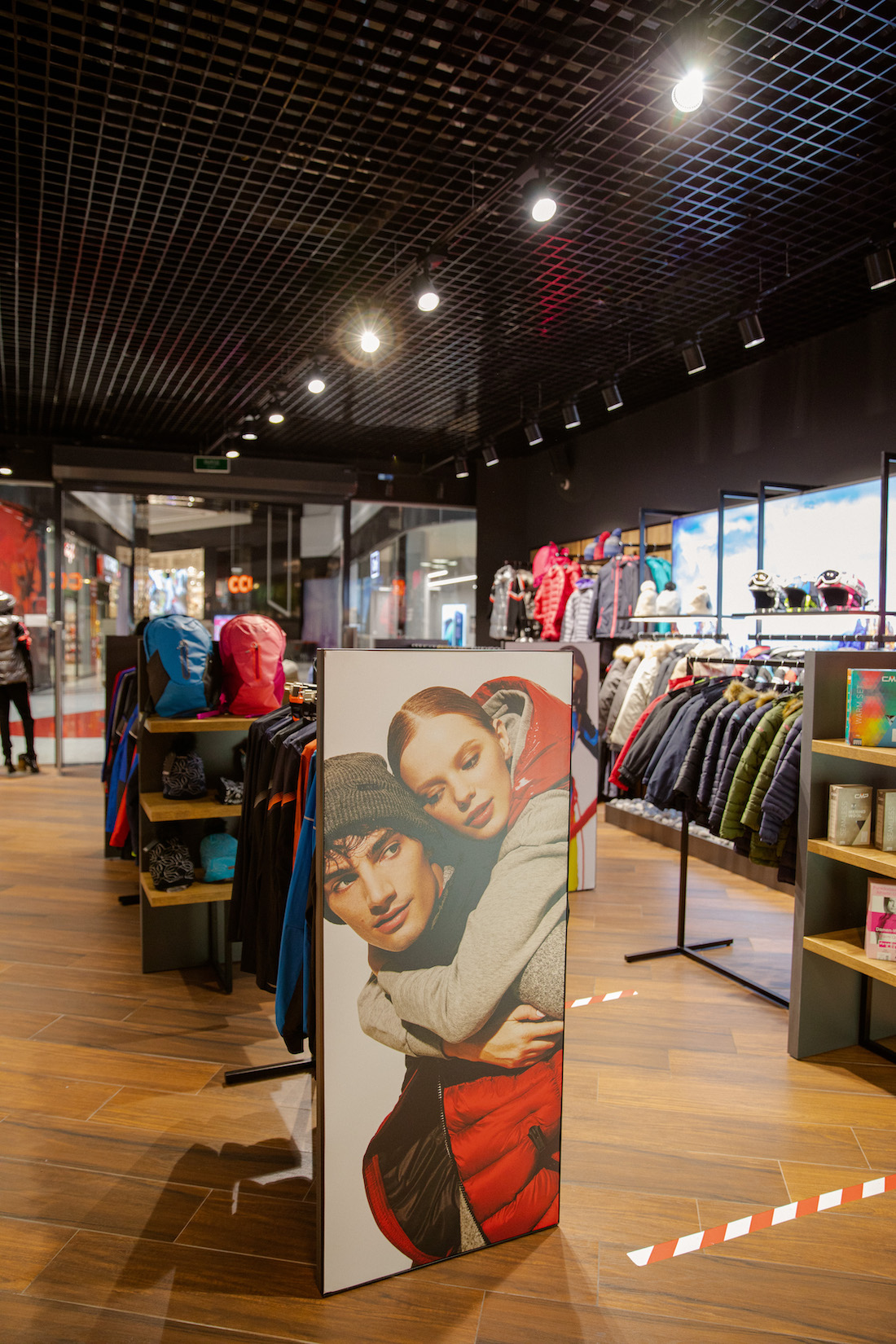 В украинском магазине площадью 120 кв.м представлен полный ассортимент бренда: линия для занятий спортом в зале и на открытом воздухе, горнолыжные коллекции, одежда и обувь для походов и трекинга, практические аксессуары для активного отдыха и спорта. Также здесь можно выбрать верхнюю одежду и обувь из городской линейки.