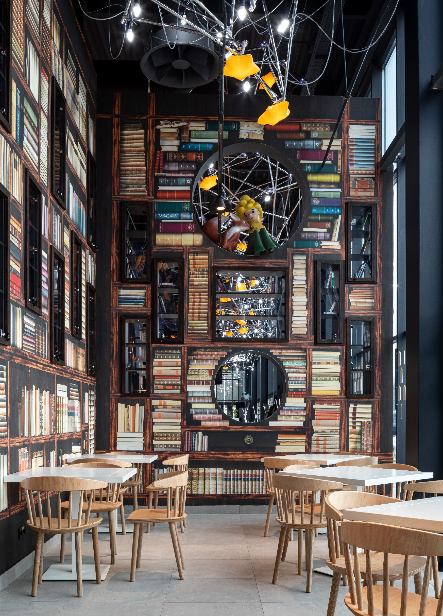 В "Сильпо" хотели выбрать тему созвучную названию села Счастливое. Это было едва ли не самое интересное в обсуждениии - как отразить счастье в дизайне. Идея с "Маленьким принцем" появилась не сразу. Площадь нового супермаркета составляет 2370 кв. м. В оформлении присутствуют герои произведения: маленький принц и лис, а также зведное небо, планеты, самолет, роза в колбе.