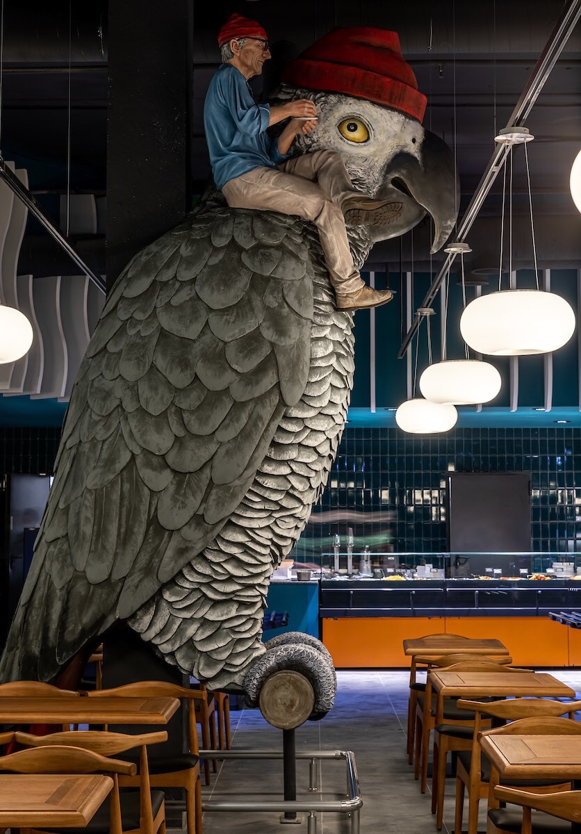 В обновленном магазине есть особые рыбный и мясной отделы, сокровища собственного импорта из более чем 80 стран мира и отборные фермерские продукты от «Лавки традиций», цветочный бутик и кофейня с кофе собственного обжаривания Feel_trd. А у кафе в своей фирменной красной шапочке присел отдохнуть на плече огромного попугая Жако старый добрый Жак-Ив Кусто.