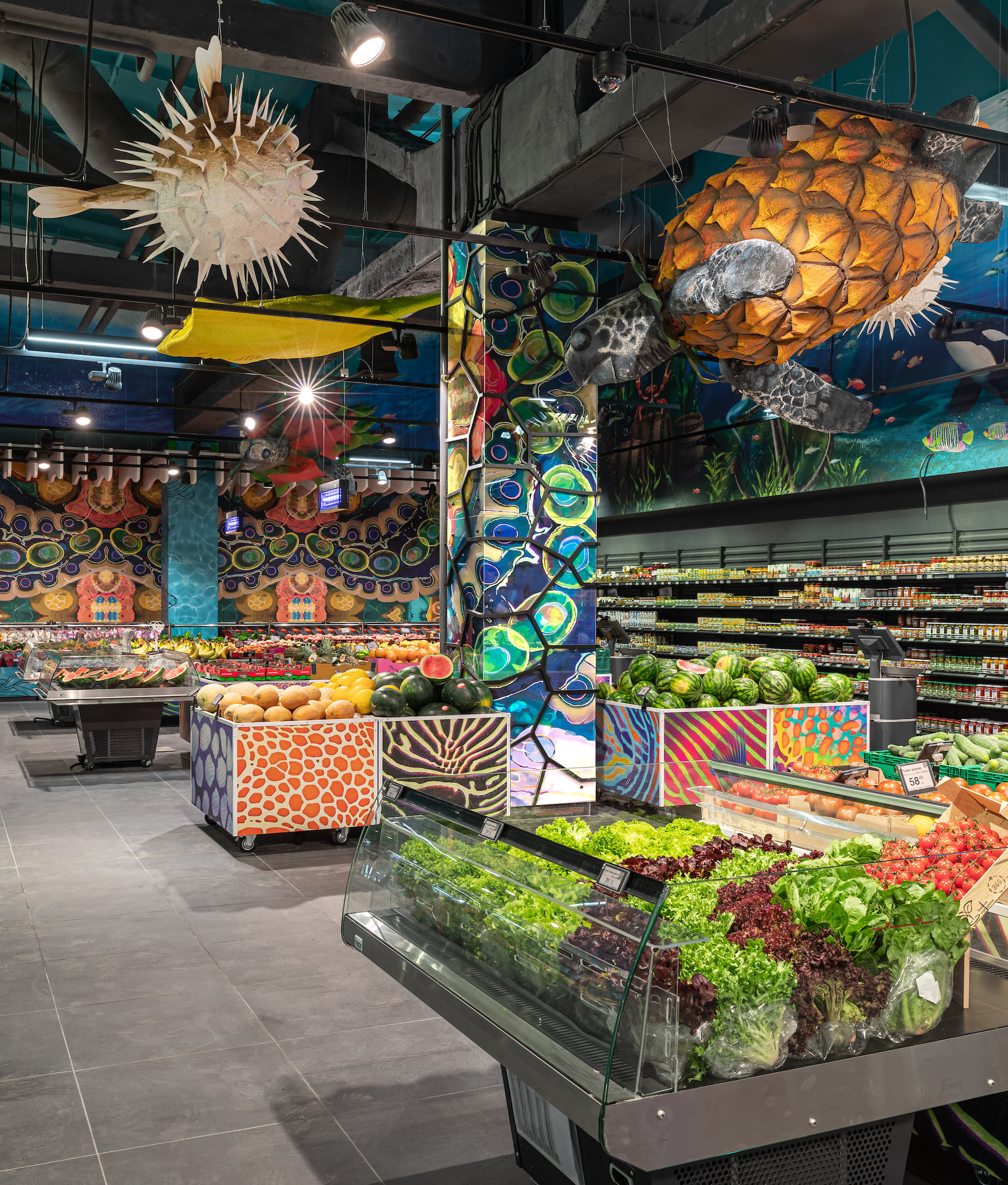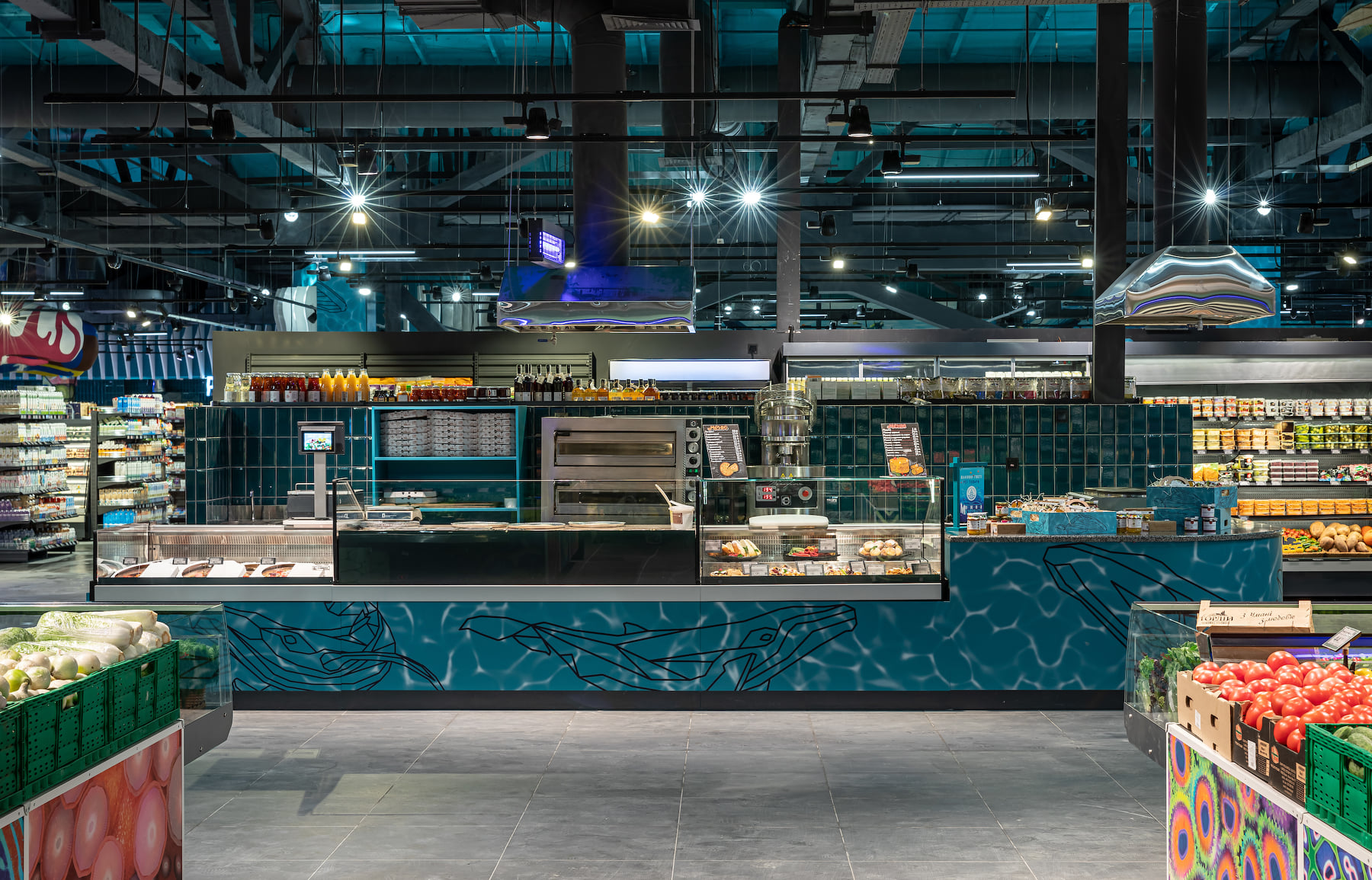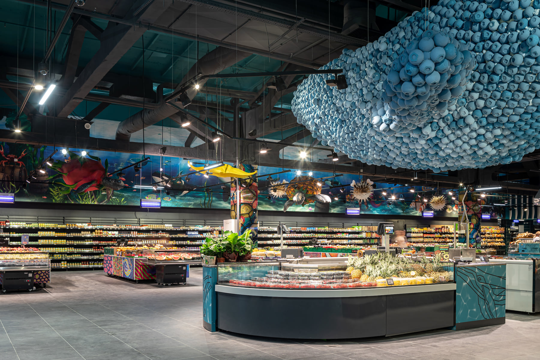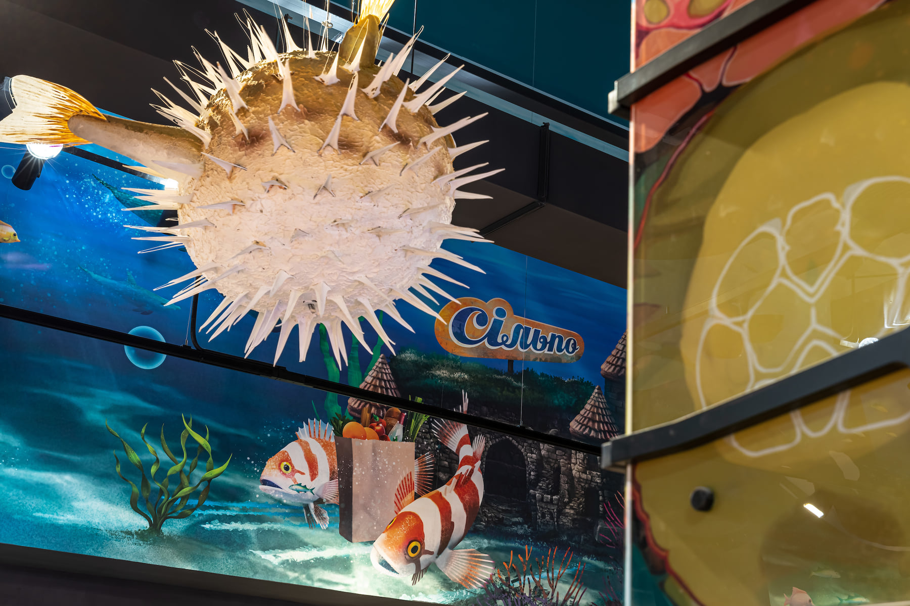 4418 м2 торгового зала - фантастическое подводное путешествие. Над отделом «Собственной кондитерской» три кита держат мир – конфеты «Вулкан», макарун и дом из печенья. Над отделом экзотических овощей и фруктов ныряют удивительные обитатели океана: скат-лимон, черепаха-ананас, черепаха-питахая, рыбы-ежи с корзинами «Сильпо», а интерактивный кит из голубики пускает фонтан.