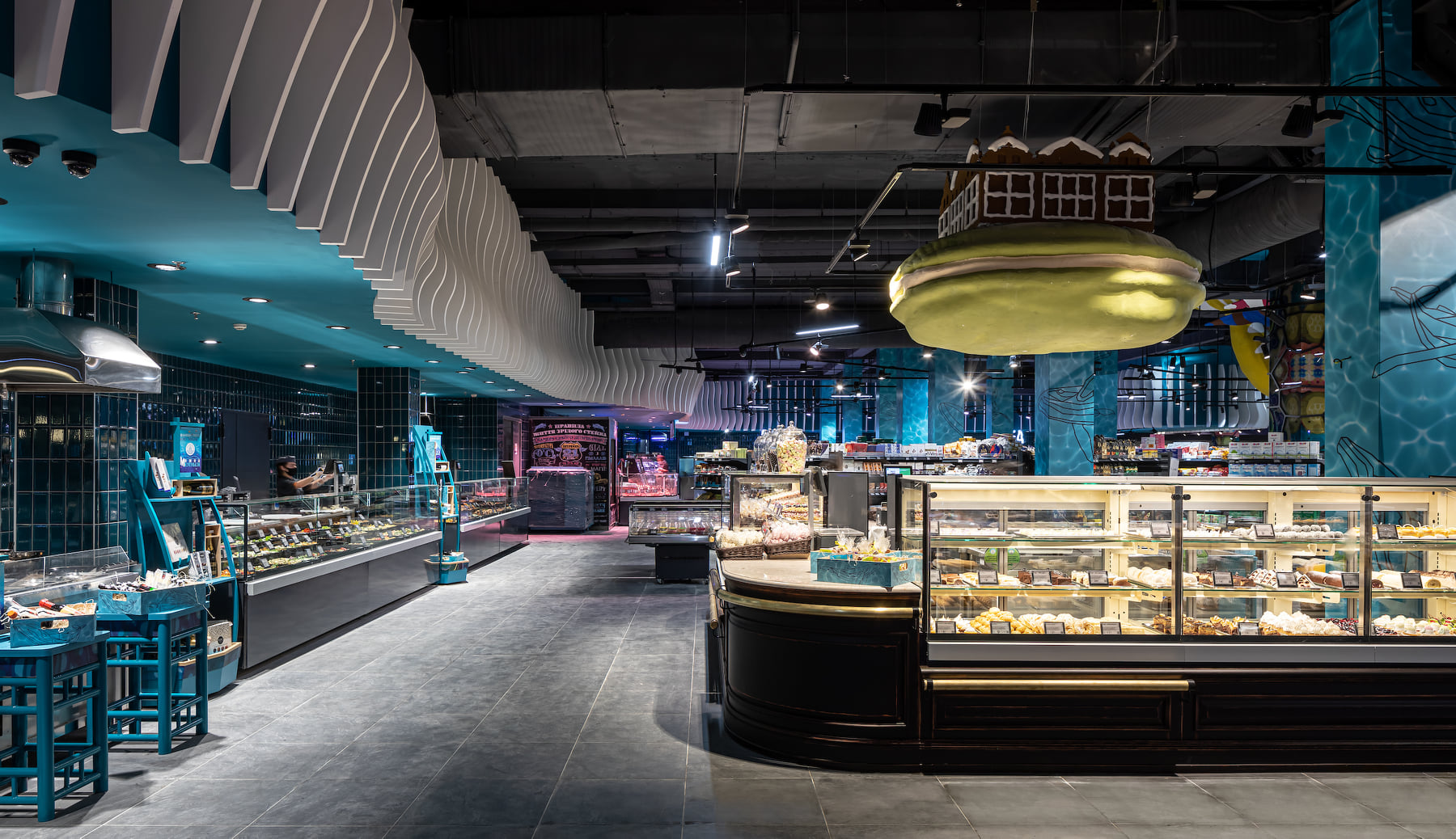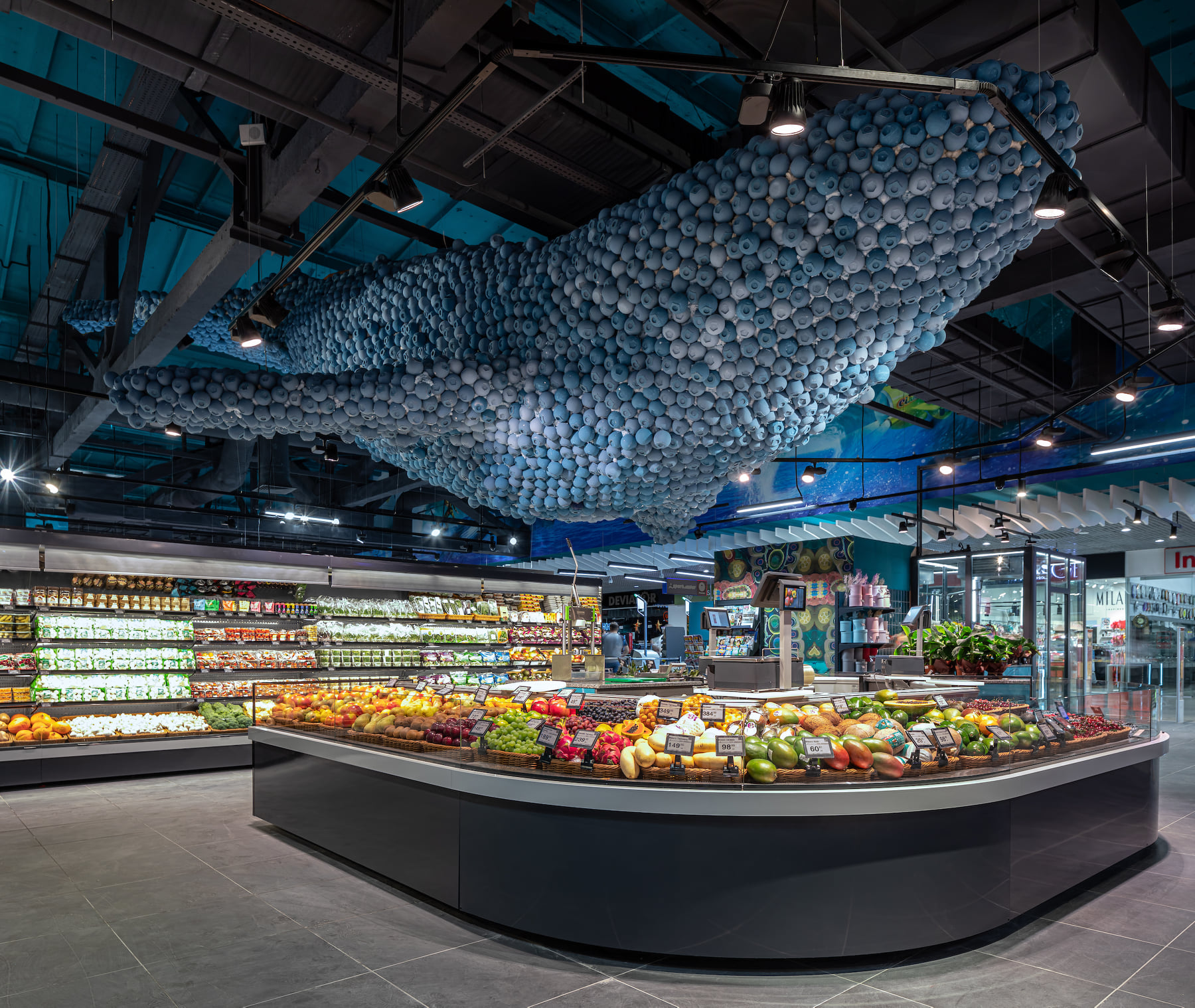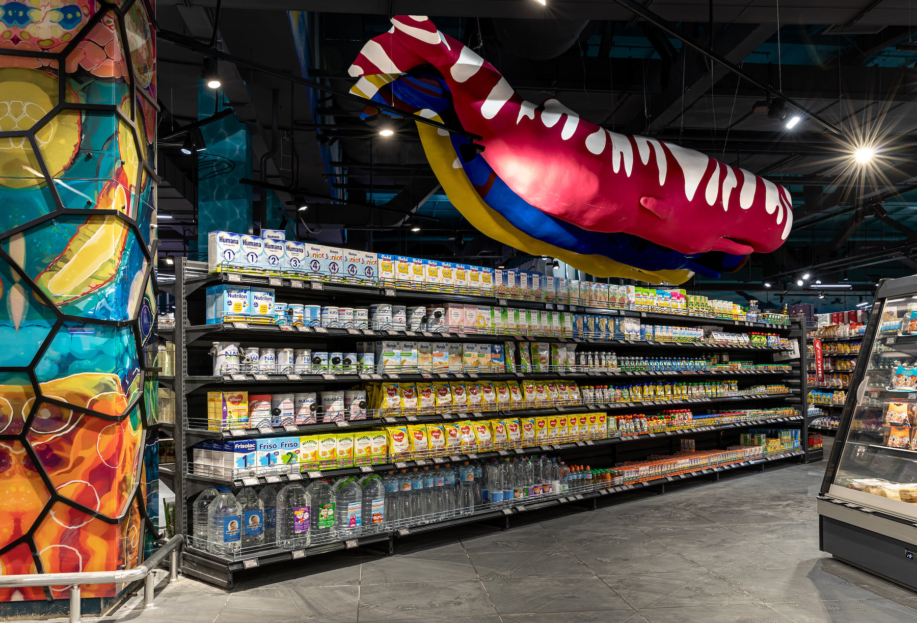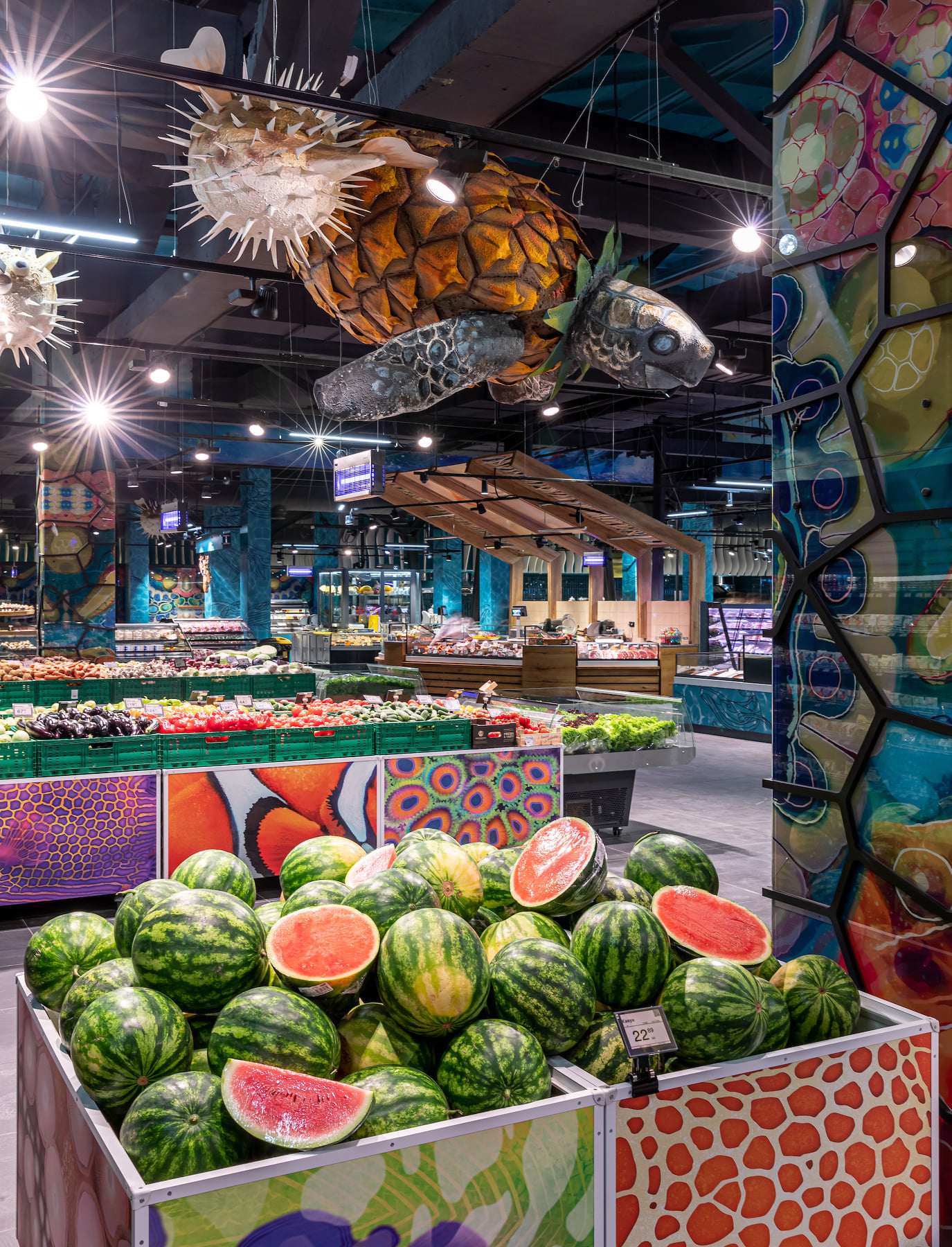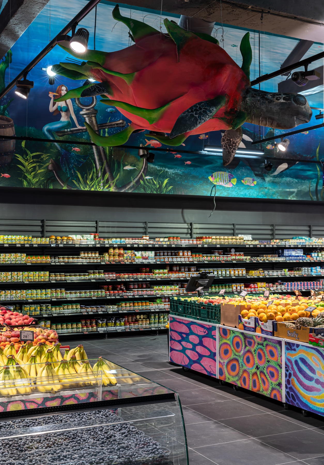 4418 м2 торгового зала - фантастическое подводное путешествие. Над отделом «Собственной кондитерской» три кита держат мир – конфеты «Вулкан», макарун и дом из печенья. Над отделом экзотических овощей и фруктов ныряют удивительные обитатели океана: скат-лимон, черепаха-ананас, черепаха-питахая, рыбы-ежи с корзинами «Сильпо», а интерактивный кит из голубики пускает фонтан.