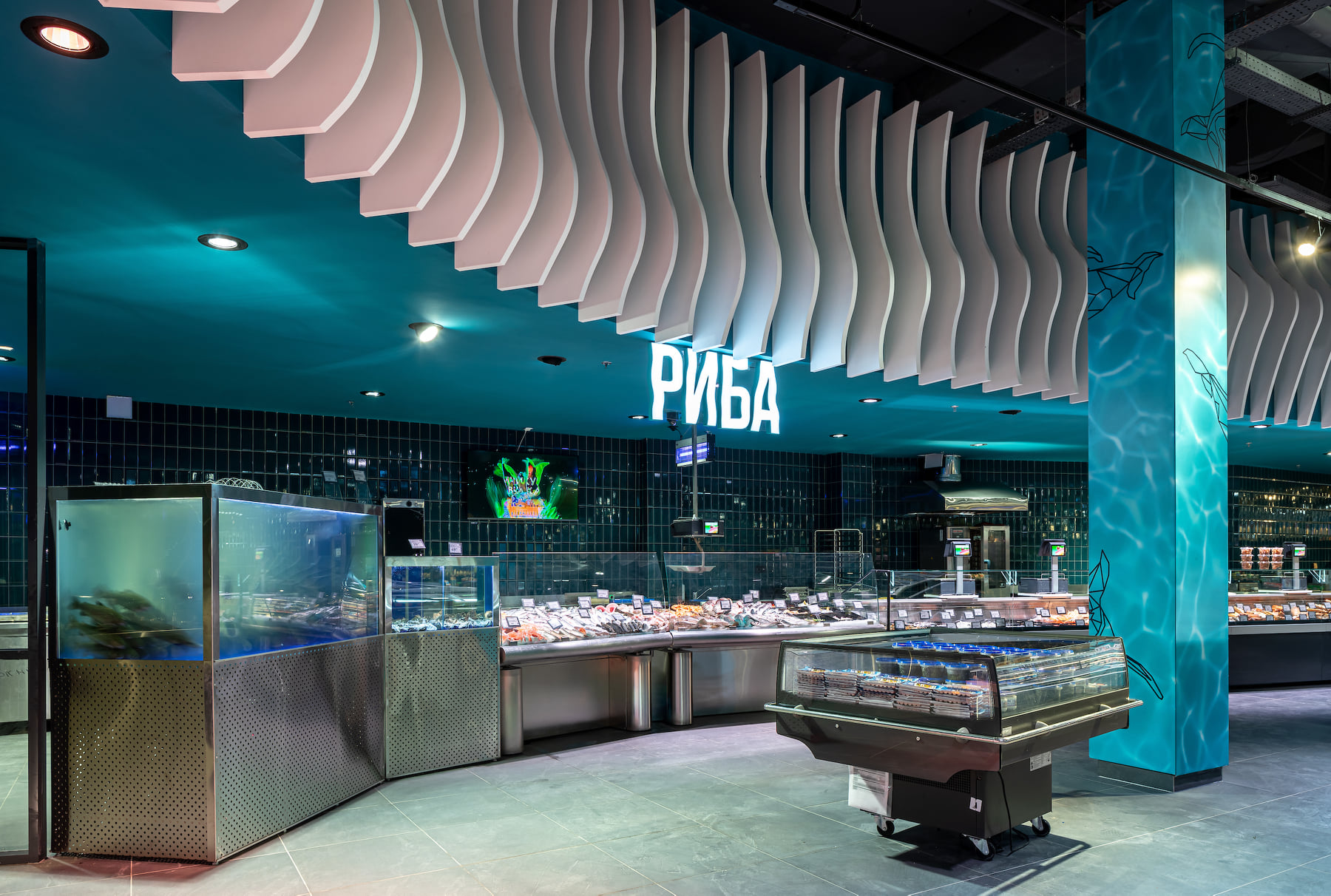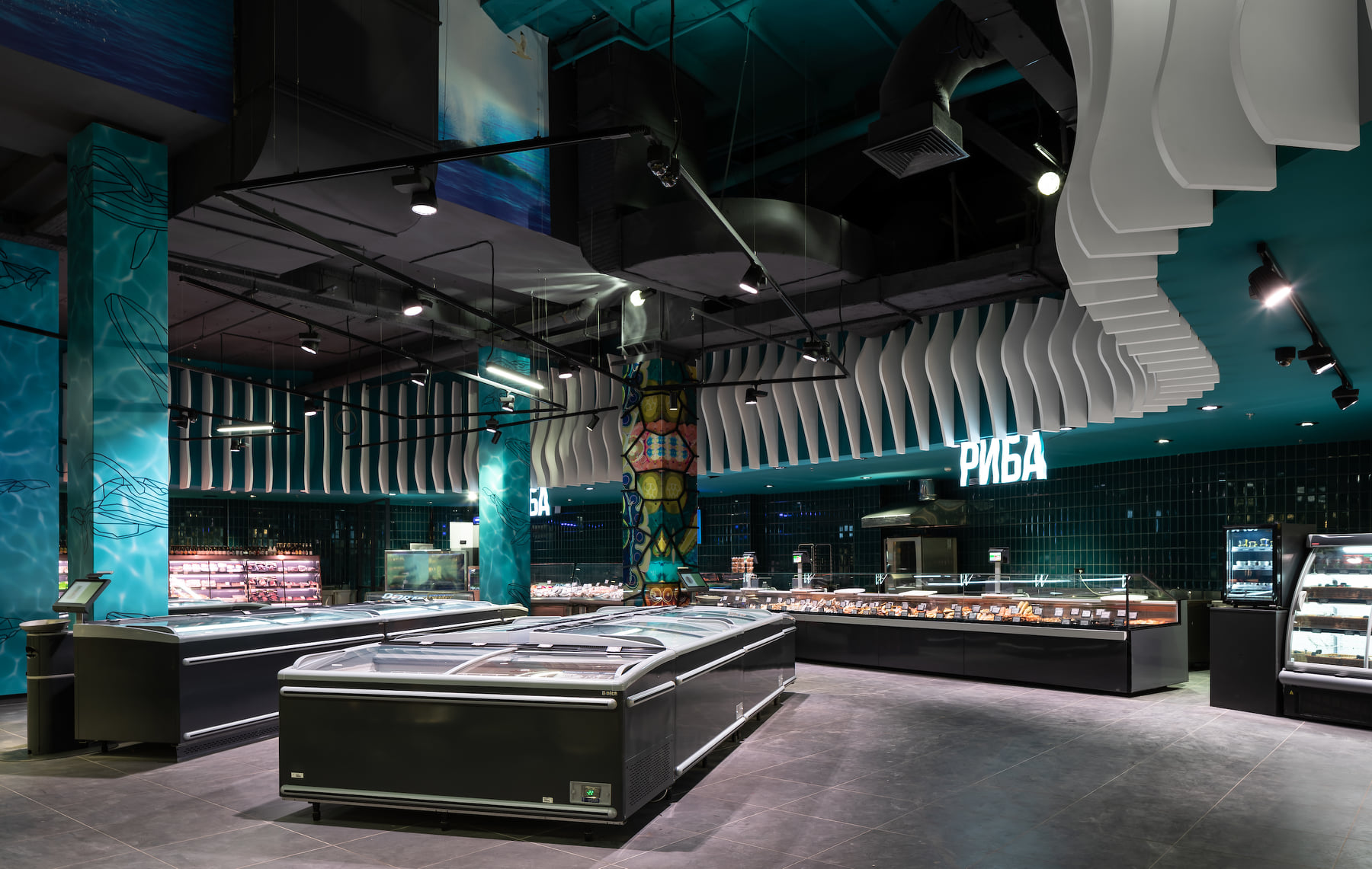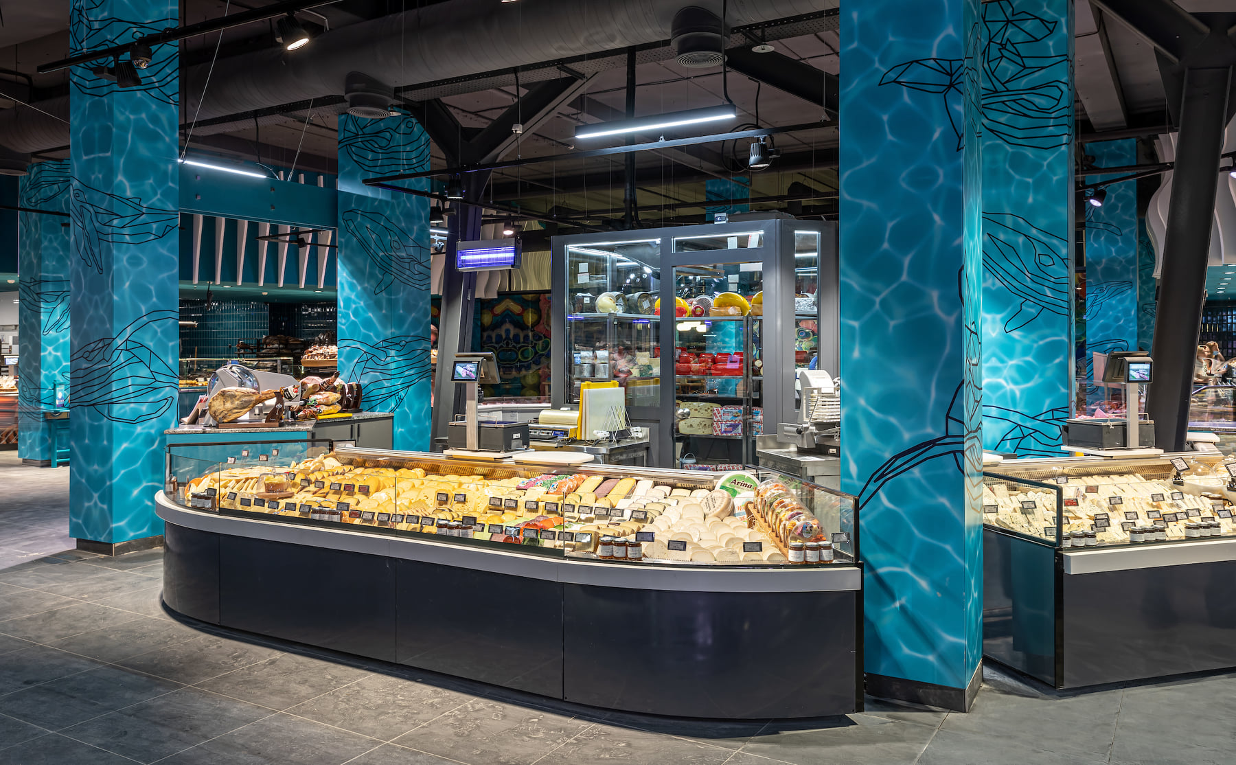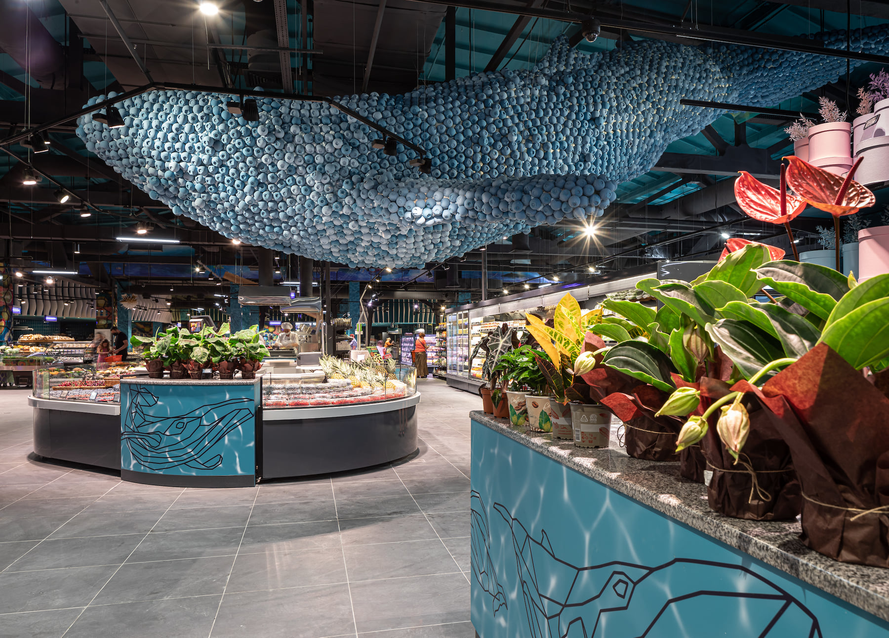 4418 м2 торгового зала - фантастическое подводное путешествие. Над отделом «Собственной кондитерской» три кита держат мир – конфеты «Вулкан», макарун и дом из печенья. Над отделом экзотических овощей и фруктов ныряют удивительные обитатели океана: скат-лимон, черепаха-ананас, черепаха-питахая, рыбы-ежи с корзинами «Сильпо», а интерактивный кит из голубики пускает фонтан.