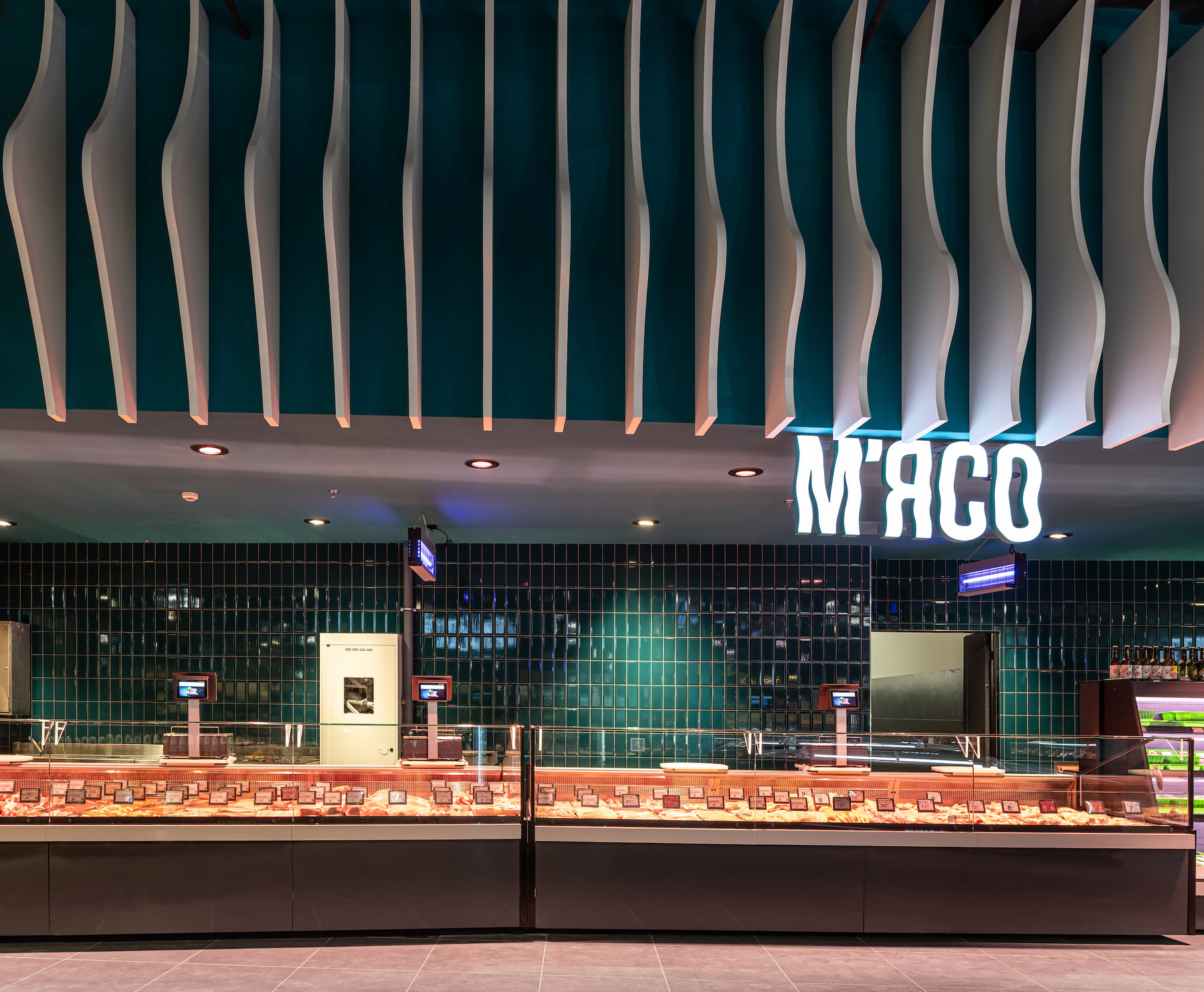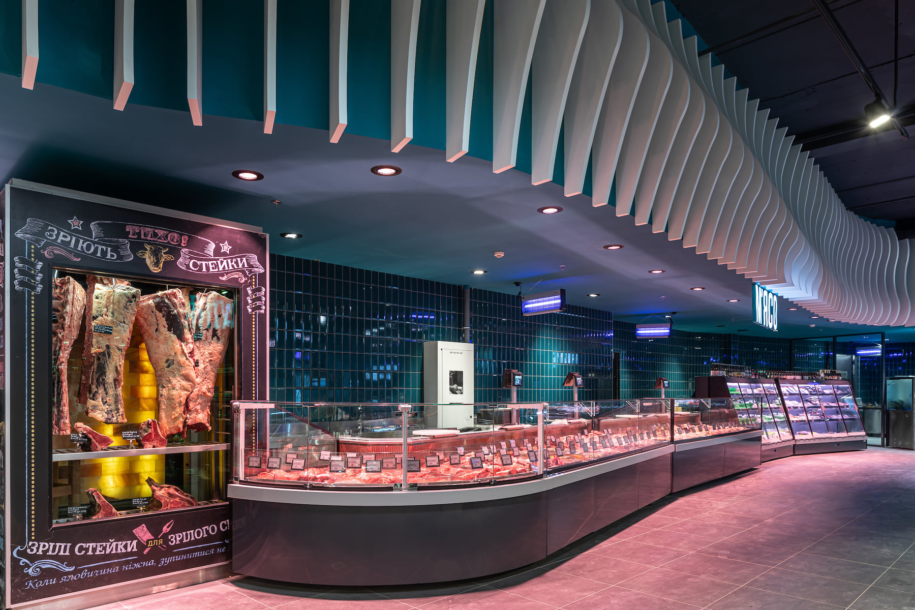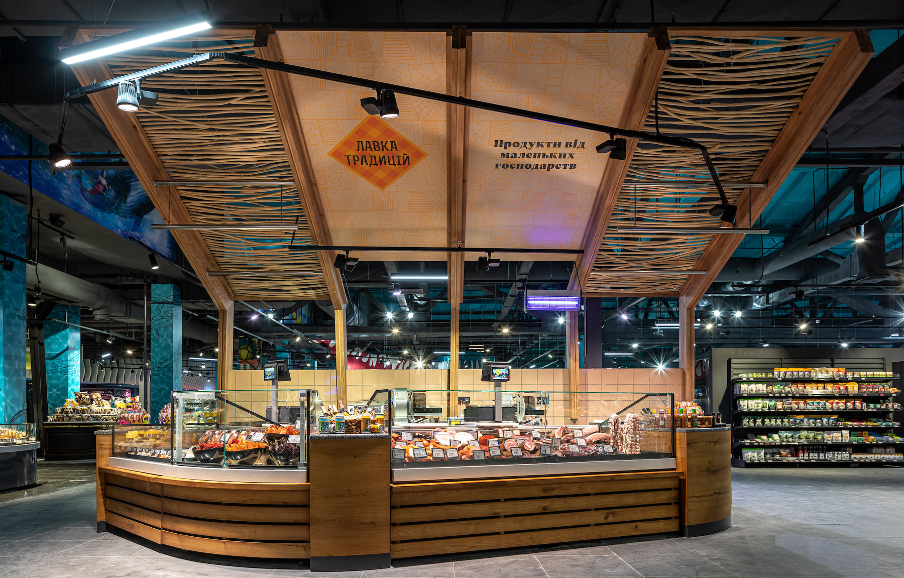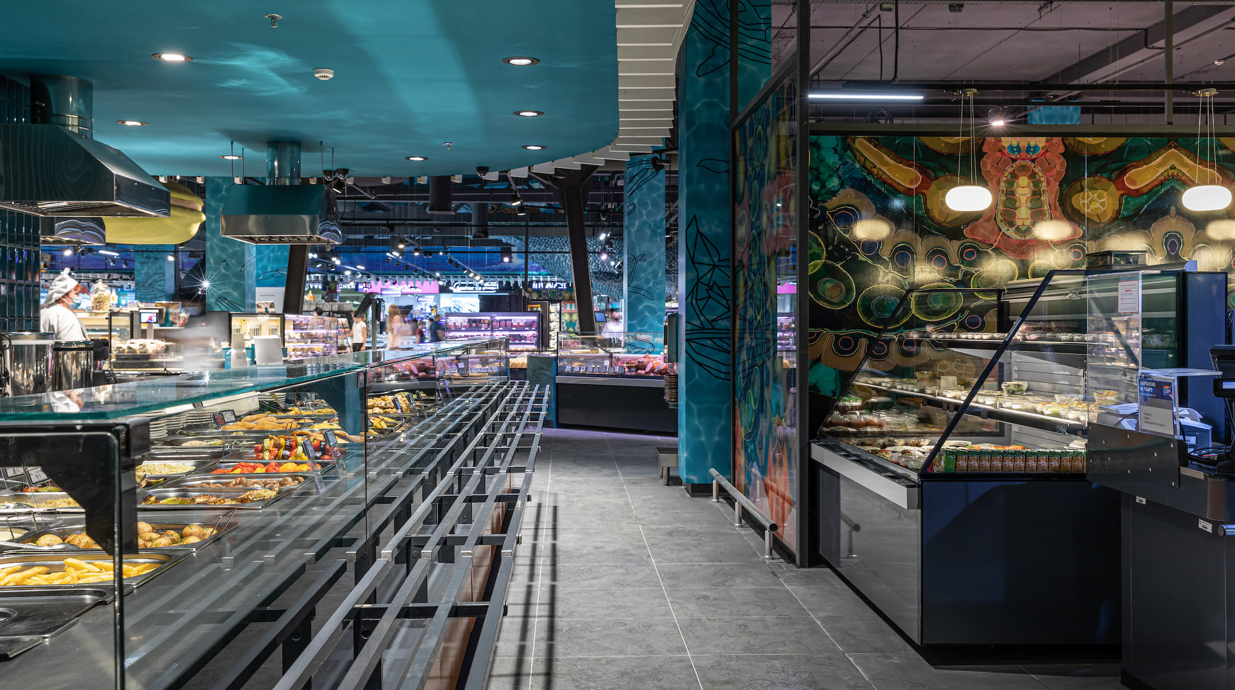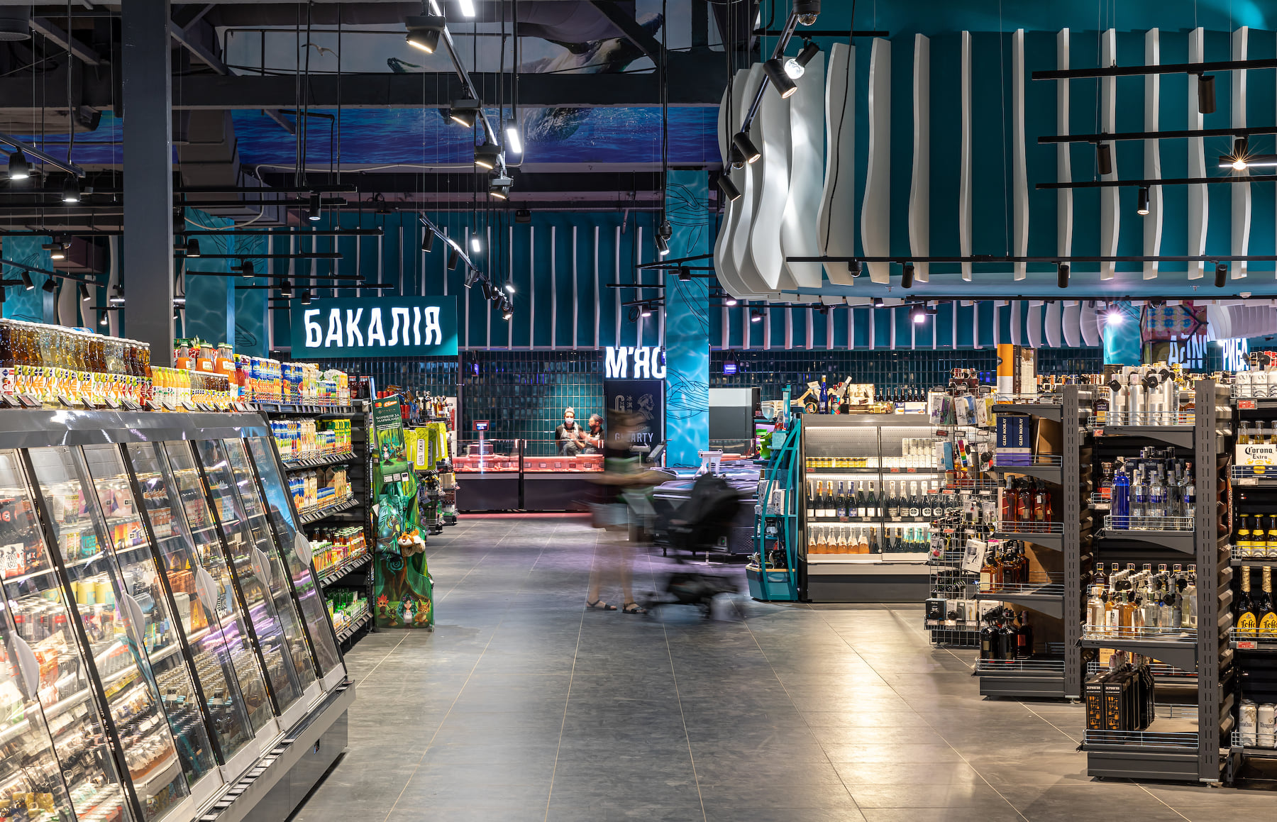 4418 м2 торгового зала - фантастическое подводное путешествие. Над отделом «Собственной кондитерской» три кита держат мир – конфеты «Вулкан», макарун и дом из печенья. Над отделом экзотических овощей и фруктов ныряют удивительные обитатели океана: скат-лимон, черепаха-ананас, черепаха-питахая, рыбы-ежи с корзинами «Сильпо», а интерактивный кит из голубики пускает фонтан.